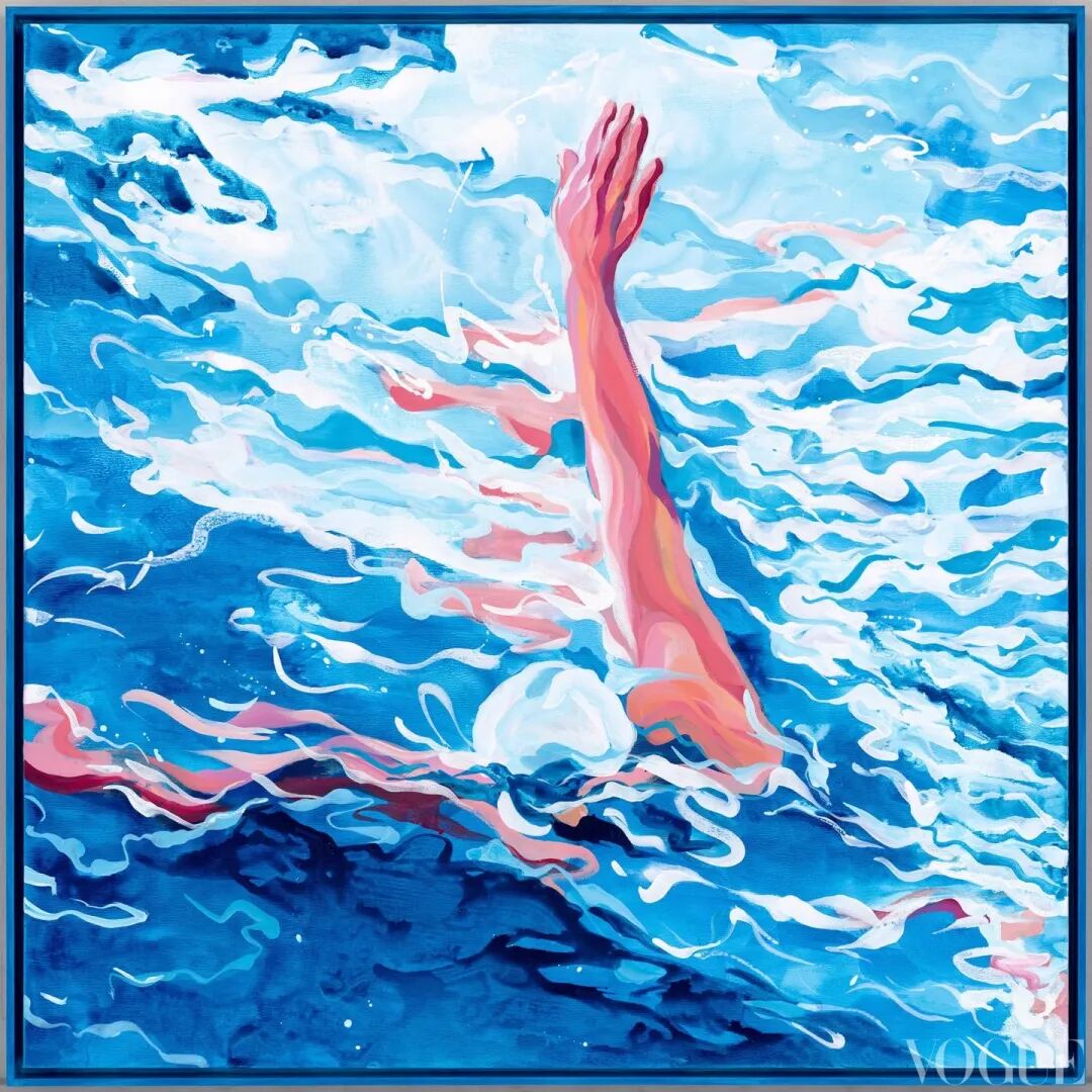 《水中人-离》,布面丙烯, 100×100cm,2023 在《水中人》系列中,冯蕤以蓝色为基调,创造了一种富有安全感的氛围,“蓝色对于我来说,代表着平静的秩序,同时也象征着内心的透彻,它是自由的。”而在新作品中,有两幅相对静态的《水中人》则选择了对比强烈的玫粉色,“对我来说,玫粉色是一种全新的画面尝试,它在视觉上更富冲击力,但又不会让人感到焦灼。我希望通过不同的颜色表达,对之前的《水中人》系列进行补充。”如果说蓝色系列是一种冷静的旁观者姿态,那么粉色则代表着作者的自我审视,视角的转变也是冯蕤在创作过程中更多的一种探索与尝试,“很多时候我都在思考,从毕业到步入社会,我未来的创作方向会是怎样的。粉色系列也是一种自我思考。我希望以不同的视角将《水中人》这个系列的可能性打开,它可以在泳池,可以在浴缸,也可以存在于我们内心的泡沫中。” 冯蕤是敏锐的,她的表达源自她最本真的情感反应,“ 我的老师曾对我说过这样一句话:你是什么样的状态去画这个作品的,观众一眼就能看出来。所以,当我在面对画布的时候,会尽量做到坦诚,这样你才能真正表达你内心想表达的。”冯蕤就是这样与她的创作共生:发现、实验、对话、挣扎,直到和解与重生。
