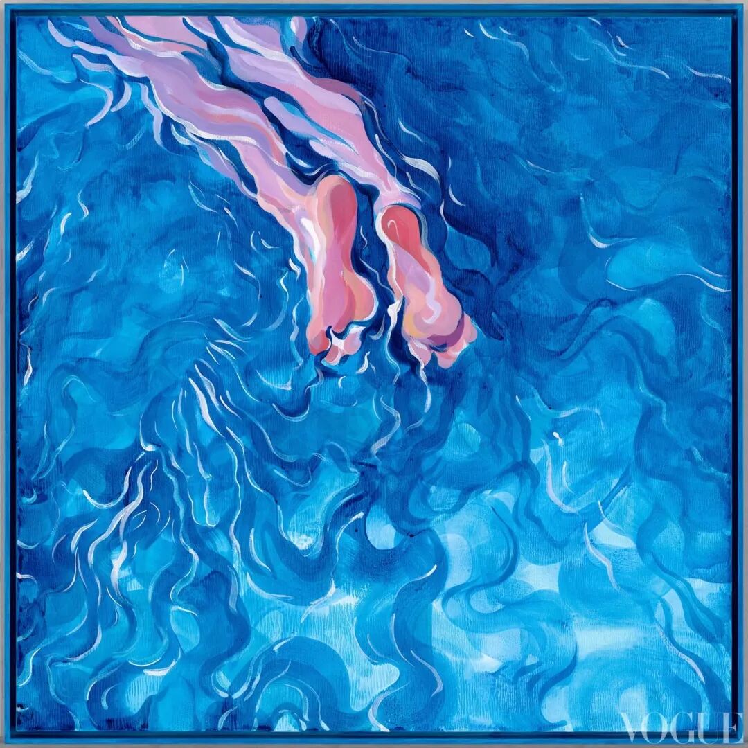 冯蕤是位真诚的创作者,绘画是她表达内心与时代烙印的镜子。冯蕤创作风格的形成离不开敏锐的自我观察,以及对周遭环境与社会现象的精准捕捉,她的《水中人》系列就脱胎于此。“创作《水中人》系列时,我困顿于当时的环境,自己就仿佛一名游泳初学者被围困于未知水域——迷茫、焦灼,也有压抑。同时,关于女性群体生存境况的社会新闻层出不穷,我希望通过我的作品去表达人困顿于社会现实条件下的无力感,一种焦灼,但是又想摆脱,去抗争,最后争取到自由的状态。这和学习游泳的情况非常相似——面对困境,去适应,去解决……我们往往会拥有不同的姿态,来面对社会现实,就像我所描绘的人的身体在水中的不同情状。” 著名的物理学家沃纳·海森堡曾这样描述艺术家的创作:“时代精神或许与自然科学的事实同样是客观的事实,精神能表现出某些独立于自身所处的时代特征,因此这些特征也是永恒的。”艺术家尝试在自己的作品中理解这些特征,这类尝试将他带向某种他工作时的风格形成。水成为社会环境与生存状态的隐喻,如飞天里升腾而起的火的纹样波浪则令看似平静的水面暗含危机。“我的研究生课题也是‘当代社会身份与地位’,我还是想让创作围绕对群体身份、社会的探索,因此我之前的作品也大多聚焦于女性群体。而《水中人》系列也同样有一种对社会身份的探索与挣扎,我希望通过我的作品,能够令观者开始思考,同时也能感受到画作中传递的某种情感力量。” “艺术向我们展示了一幅图像,一幅自我的图像,一幅我们时代的图像,一种品位的图像,或一个纯粹的声音的图像。然而艺术向我们展示的图像总是模棱两可的,总是可以用各种方式(但不是任意的)来理解。”正如德国哲学家马尔库斯·加布里尔所描述的,艺术的力量往往在于其不确定性,它带来了一种想象力的可能。这也是冯蕤几乎不以人物正面或整体进行创作的原因之一,“现代社会对于每个人、每个群体都有着太多的误读,尤其是对于女性群体来说。创作《女孩》系列时,正值我本科毕业,当时我就想表达年轻女孩面对那种迷茫与纠结的状态,但又不想去对这种状态下一个完全绝对的定义,因此当我作画的时候我干脆把自己退出来,去描绘人物的背影,以一种旁观者冷静的姿态作画。让观者通过一些细节的观察与分析,去揣摩当事人的情感。这样每个人都会有不同的解读,呈现的角度也会更多。我希望我的作品还是能传递出某种力量,或者是引发某些思考。” 冯蕤的创作首先是趋于颜色的感召,“当我想到V某个创作主题的时候,第一反应会想起用相应的颜色来表达情感,然后再去构思画面中的元素,以及所要传递的故事。”因此她的作品在颜色的表达上往往极具冲击力,鲜明大胆。她说:“我比较偏向于在画面中使用一些对比度强、鲜艳的颜色。我希望我的作品第一眼传递给人的是明快爽朗的愉悦感,它们首先要能吸引人。”