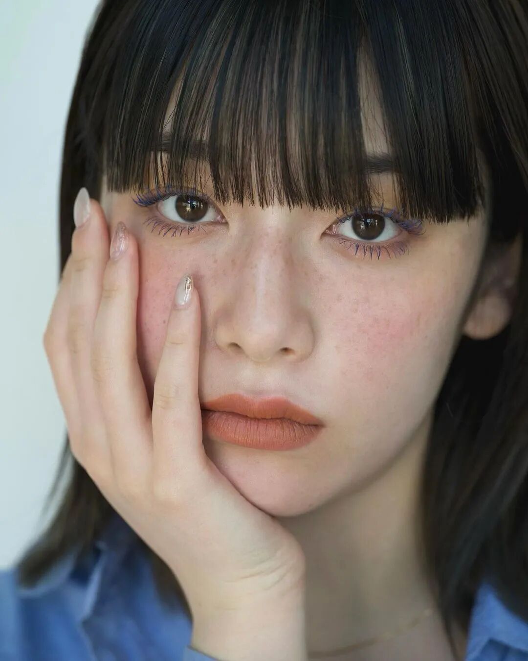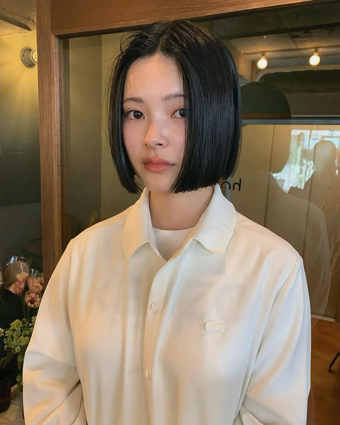 个子娇小的方圆脸女生如果担心头重脚轻,那轻量化的黑色齐肩发、齐下巴一刀切也是不错的选择,妆容的色彩可以再丰富浓重一些,时髦度翻倍。