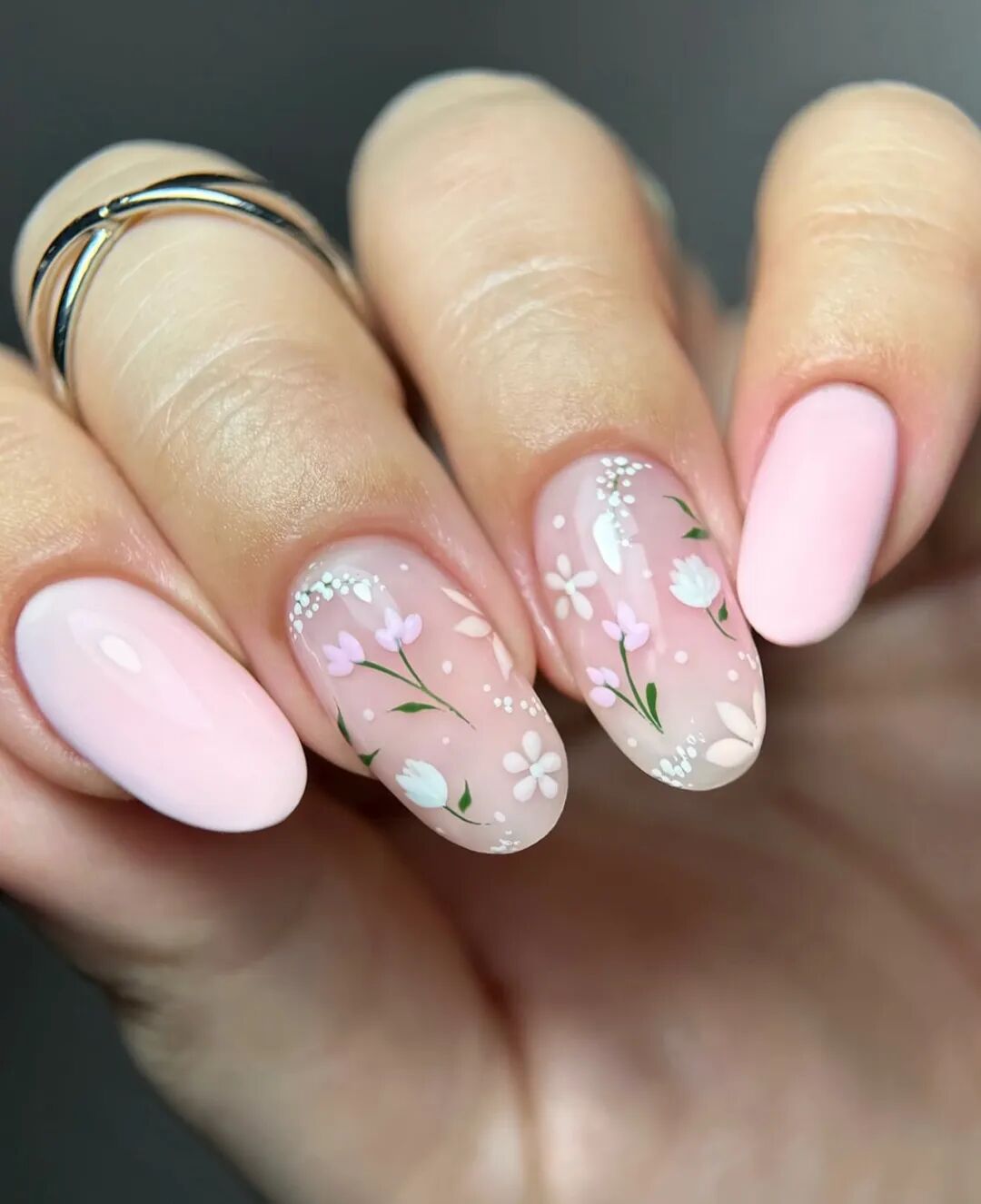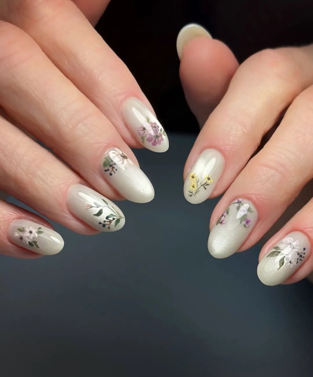 除了低饱和淡粉和白开水美甲,同样适合这个春天的,还有自带氛围感的淡雅花卉美甲。