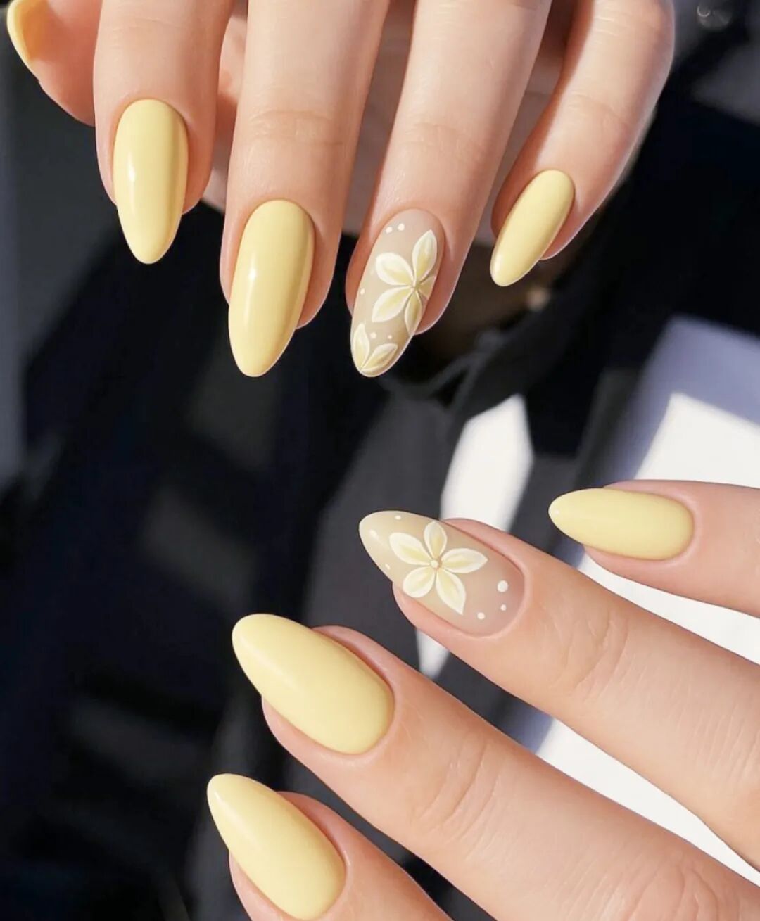 美甲们不再用夸张的彩色钻石来装饰手部,而是纷纷选择了水彩感和手绘感的极简花型:淡淡的樱花粉、嫩黄、奶白交织在一起,几笔轻描淡写的线条,就勾勒出一朵含苞待放的小雏菊或一朵樱花。