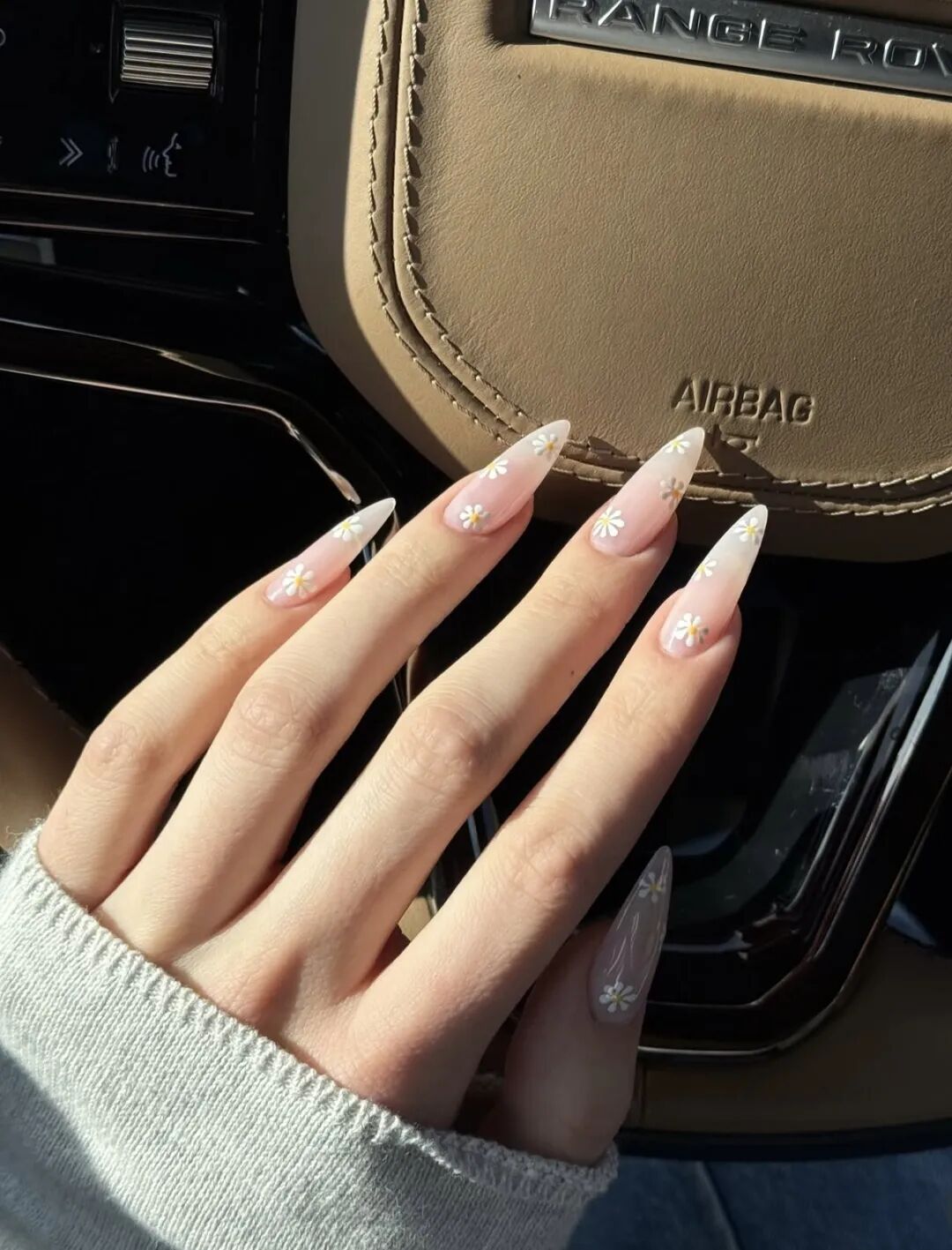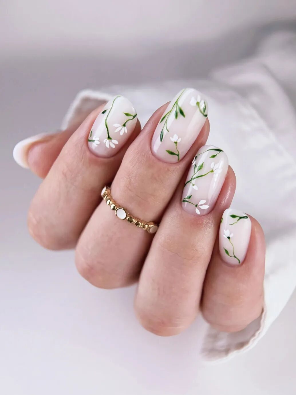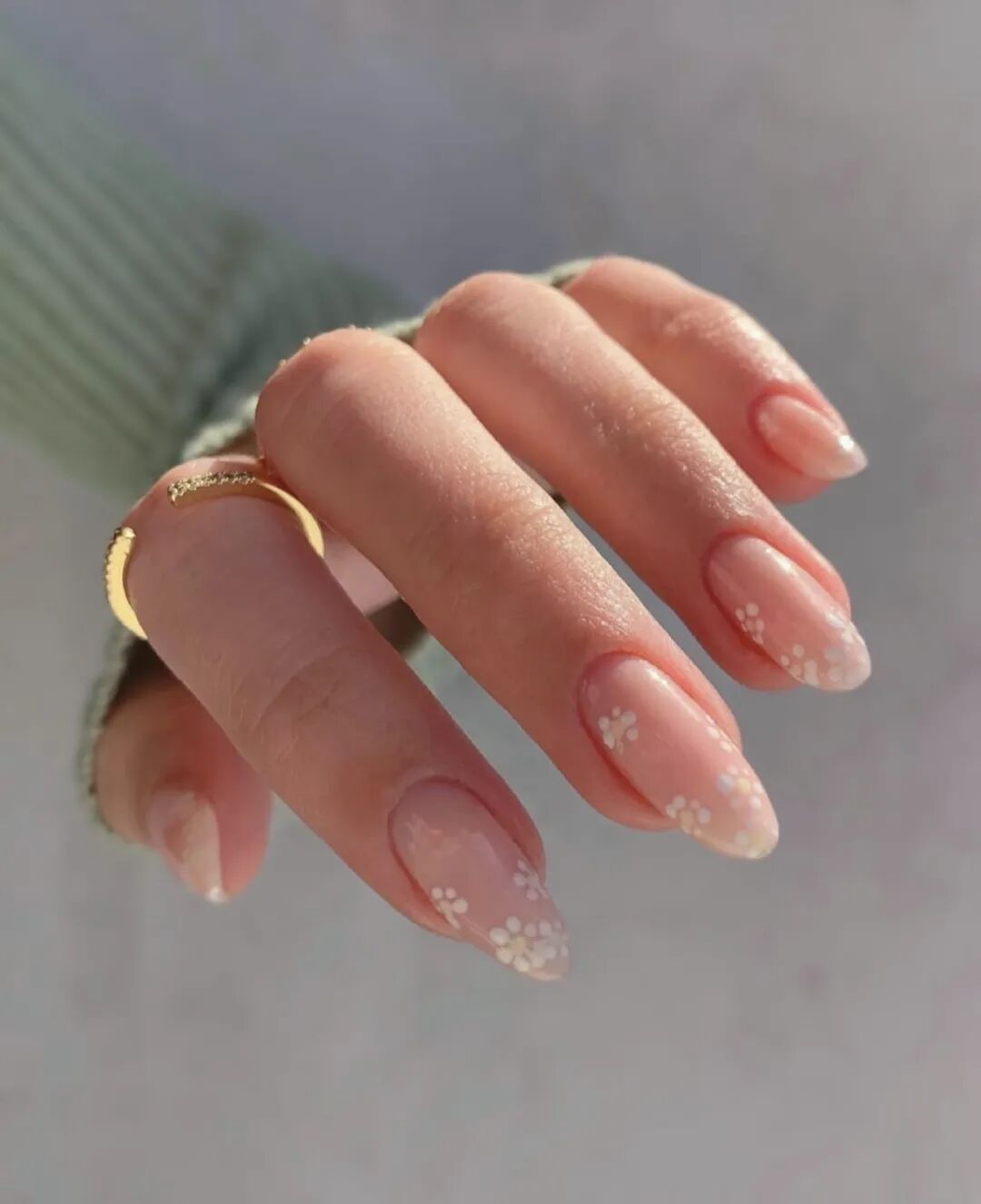 想要营造这种淡淡的感觉,千万别做那种尺寸巨大、立体感强的大花型,否则也会显得很喧哗和刻意。 最佳选择是迷你手绘小花:每朵花只有指甲盖的1/3大小,甚至只有指尖那么点大。三五朵花错落点缀,或者单指单花设计,剩下的手指保持干净的裸色或透色。这种“少即是多”的布局,衬得整双手干净又灵动,像自带了一层柔焦滤镜。