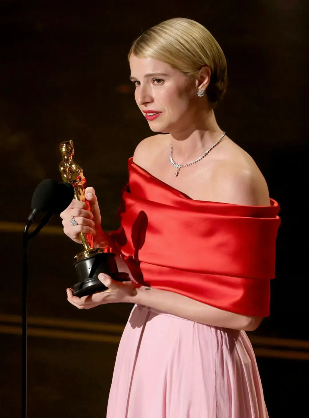 尤其在刚刚结束的奥斯卡颁奖典礼上,红毯女明星几乎人人一手淡粉色美甲。 新一届影后杰西・巴克利,捧起奖杯的时候就是裸调淡粉美甲入镜,搭配香奈儿红粉拼接高定礼服,哑光柔粉不抢礼服风头,镜头里干净又高级。