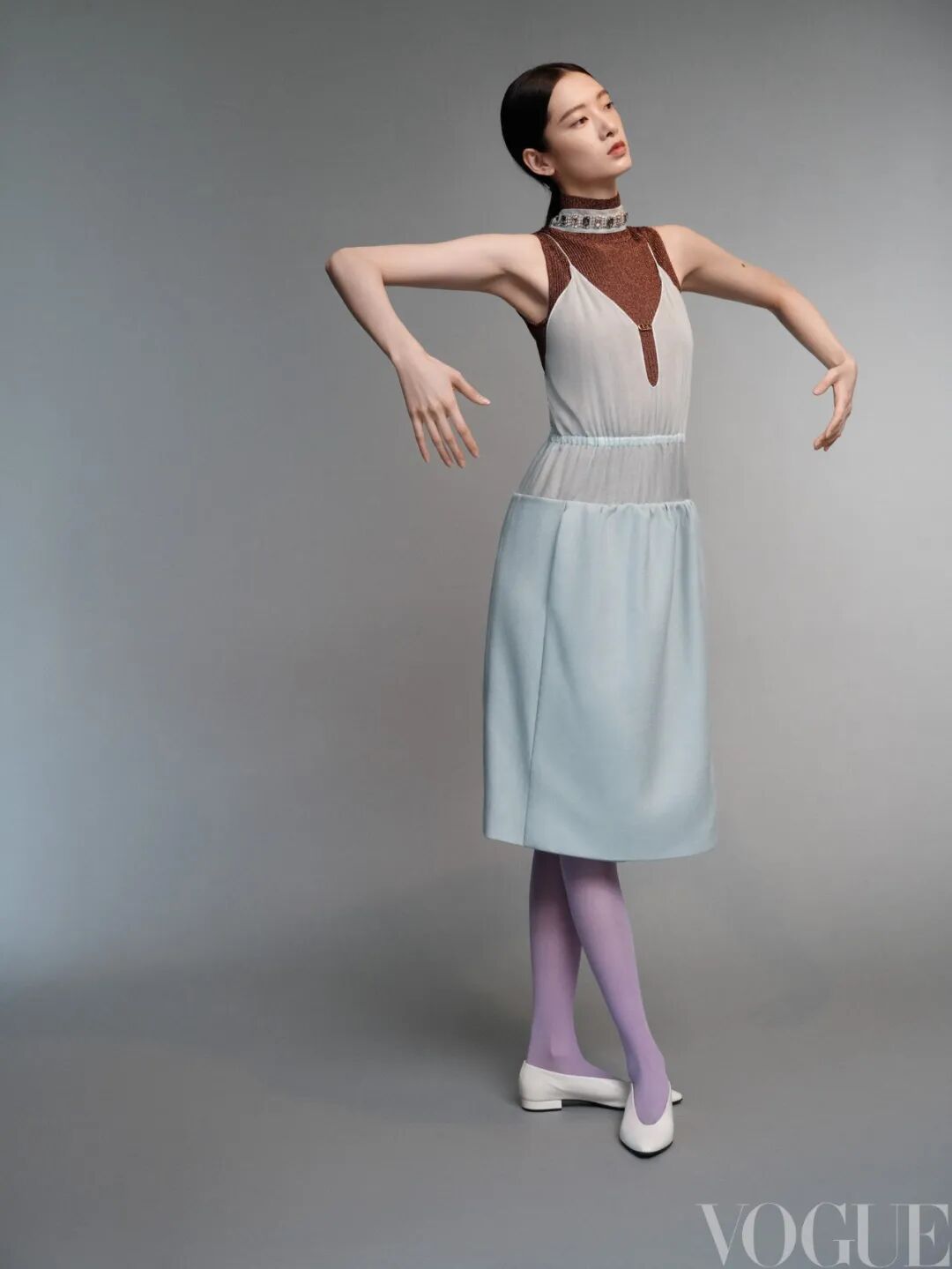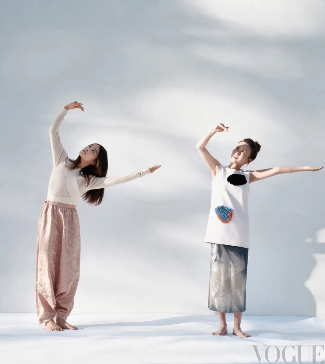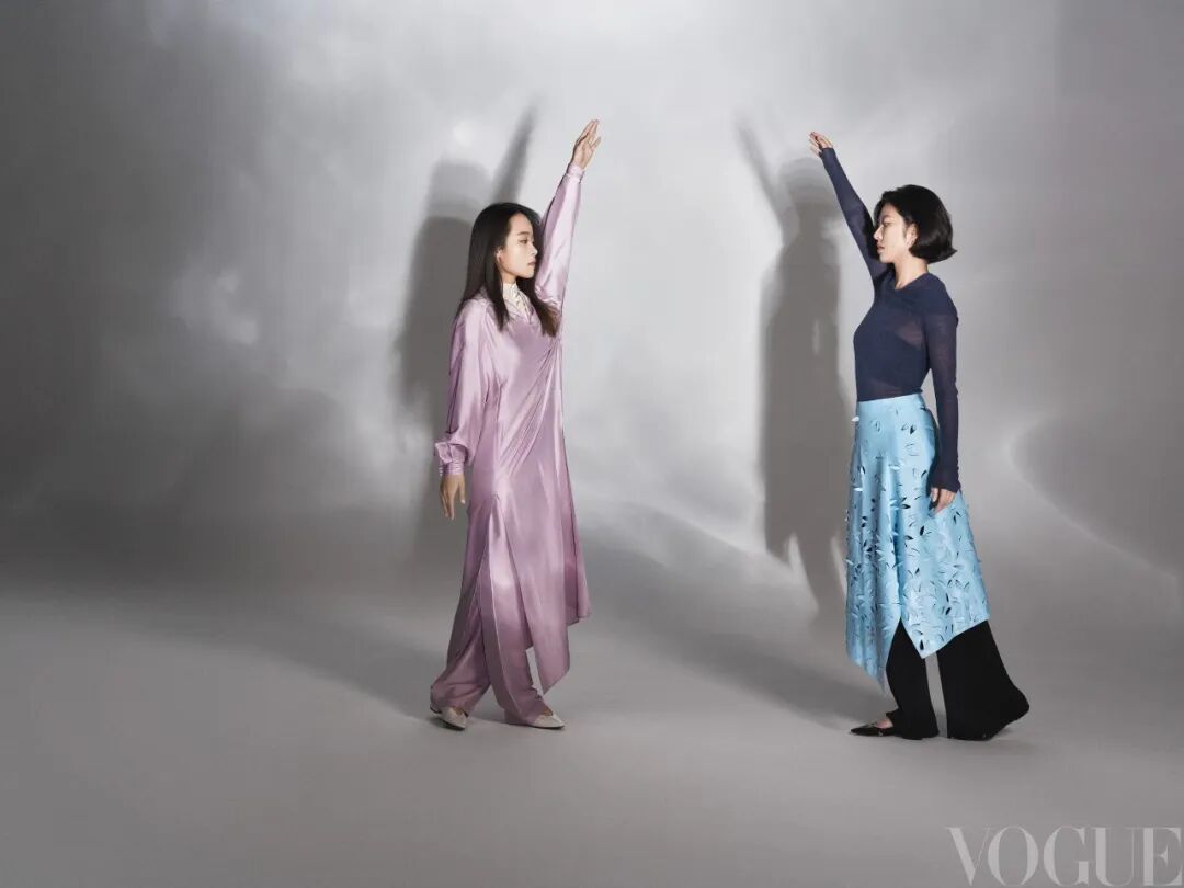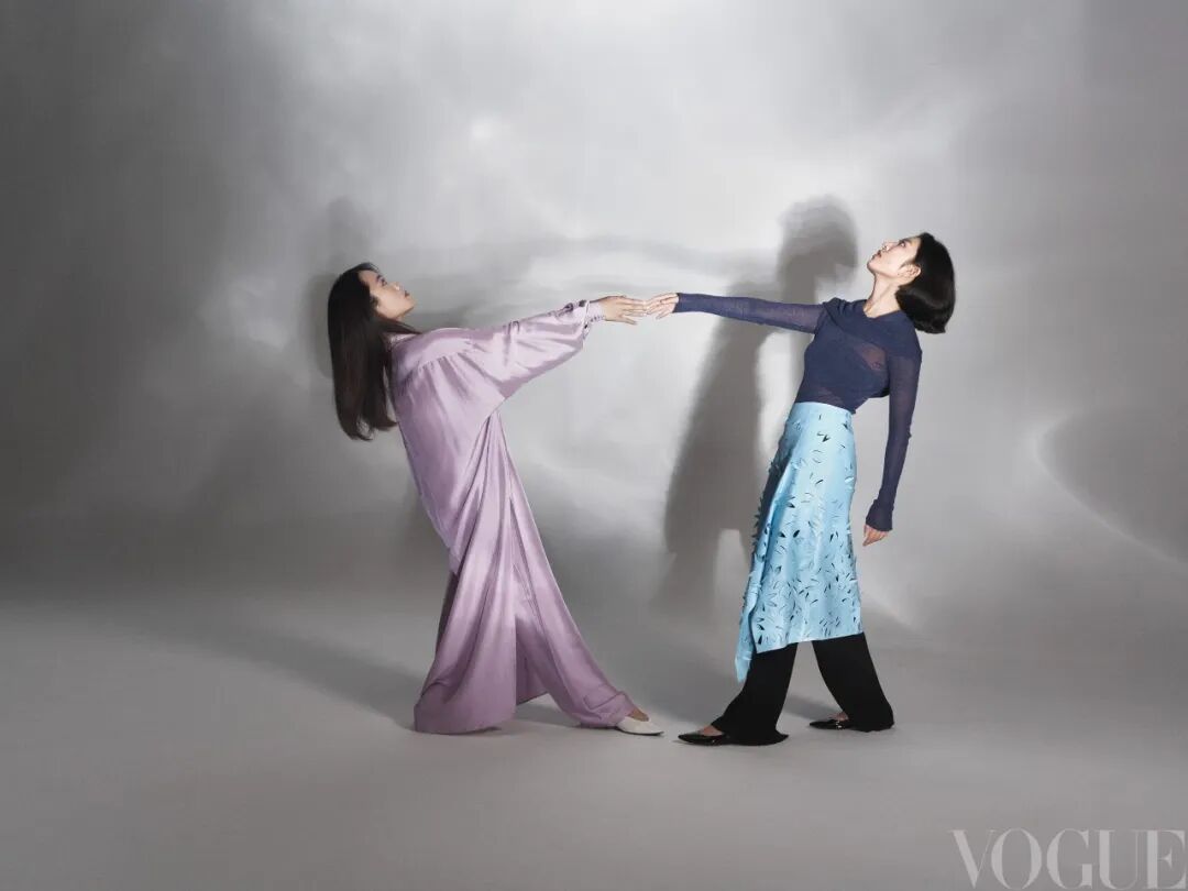 左:紫色连衣裙、长裤 均为 M Essential 白色平底鞋鞋 Loro Piana 右:长袖上衣 ii sense 蓝色花瓣镂空半身裙 Shang Xia 黑色长裤 Wolford 黑色平底鞋鞋 Gianvito Rossi