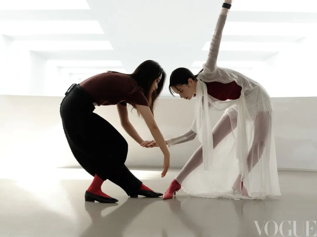 左:枣色连体衣 Wolford 黑色长裤 Issey Miyake 红色打底裤 Calzedonia 黑色平底鞋 Loro Piana 右:白色纱裙 Dolce & Gabbana 红色打底裤 Calzedonia 红色尖头鞋 Maje