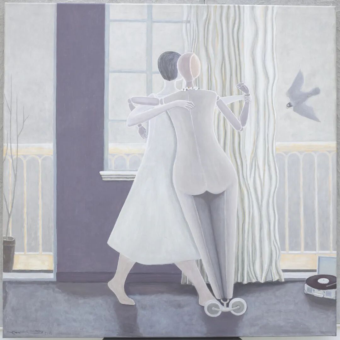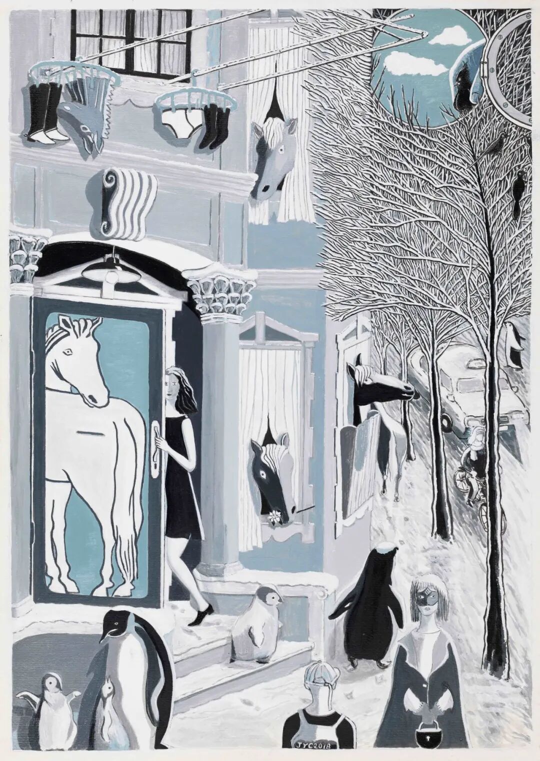 很多画里有手。有人问手是什么意思。手代表了一种意志、一种幻想,或是一种超越。手可以随心所欲。去年春天在家里待着,无事可做,买不到画板,墙上有2000年朋友送的宜家三联装饰画,干脆涂白了画成《北风》。有一双手从空中环抱整个寂静的街区,每个窗口都有小小的人影。