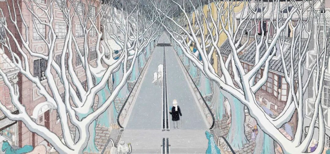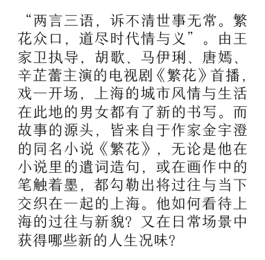 作家金宇澄在《繁花》里回顾了一个毛茸茸的上海:60年代阿宝和贝蒂爬屋顶,90年代陶陶拉住沪生在几桶大闸蟹旁尬聊。画家金宇澄把静安寺放在一个托盘上端出来,把上海的街道画成机场的传送带,让马走在城市的马路上。他常常自称老金,其笔下的上海,不只是此刻的街头小店,不只是抖落历史尘埃的一栋老房子,还是过往与当下的交织——回忆与情感穿针引线,把总有缺憾的日子缝合起来。