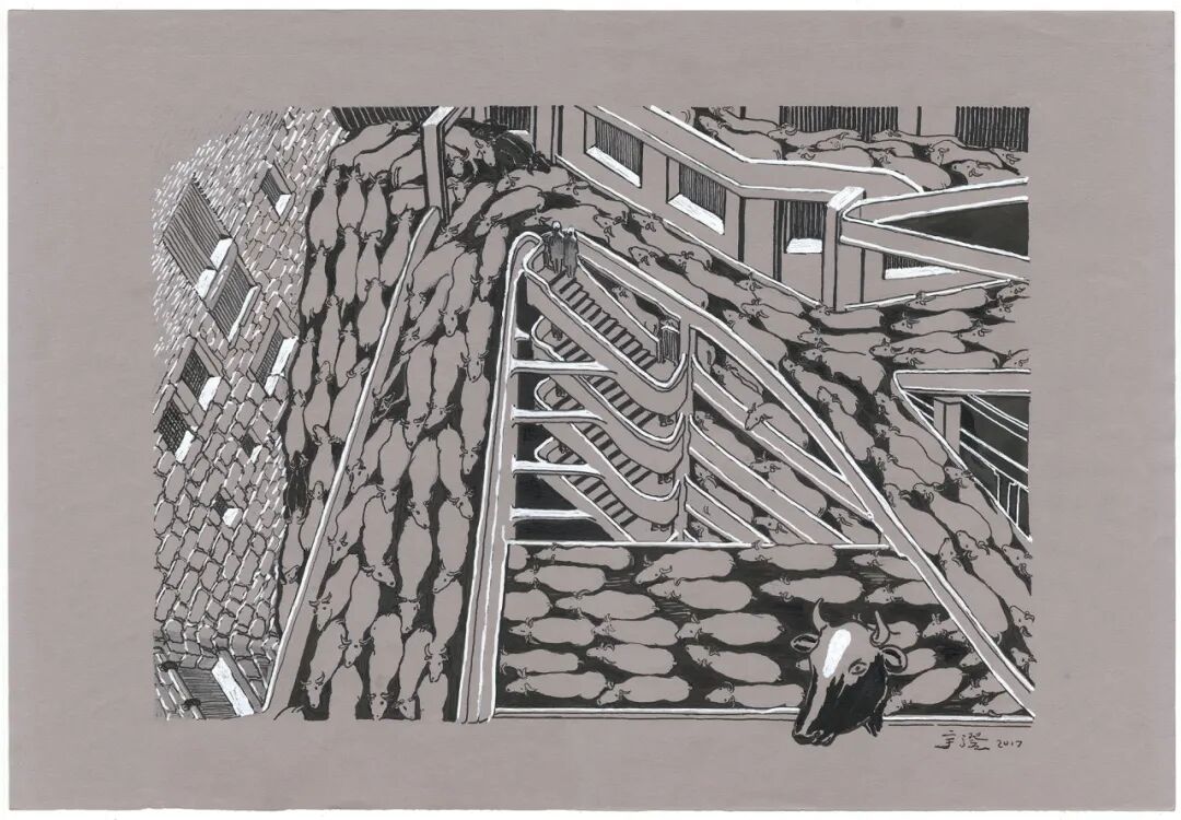有一年朋友请我去1933老场坊吃饭,进去后觉得压力很大。如果不知道历史,把一个屠宰场改造成一个文艺场所,也可以接受。但我知道历史。里面还保留着牛道,地面有摩擦力,保证牛走上去不打滑。牛道越往上越窄,变成只能容一头牛通过的时候,就把它解决了。我在东北见过杀牛,是用最快的刀把整个脑袋割下来。人类可以很残忍。 我的性格可能是这样,把一个轻描淡写的东西沉重化,让画面传递“原来是这样”的答案。所以会那样画1933老场坊,老上海人称“杀牛公司”,历史重新“回到”这个空间。我只能安慰自己,那是西人的设计,他们更早有不虐待动物的意识,吃归吃,租界也还是有“鸡鸭不得倒拎”的规定,也许那些牛在最后一刻的痛苦没有那么多。