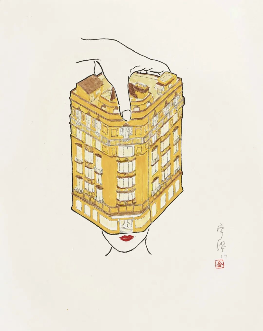 以前也画过一栋板式高楼,像一个柜子,一只手把它揭开,露出内部陈列的传统中国各式屋宇。想起一部苏联老电影,男主喝醉错误进入另一座城市,但房子都一样,小区千篇一律,家门钥匙也是统一的。他用自己家钥匙打开了别人的门,室内摆的家具,也跟他家一样,他就在别人家里睡着了。如今我们也和这部电影一样,按说生活是提升了,但也越来越格式化。 很久以前追过一个日本电视节目,《去到乡下住一晚》,每期是请一个嘉宾去任何地方跟拍,通常是黄昏,整个摄制组在不知名的小站下车,挨家挨户敲门,能不能借住一晚?通常敲到第三户人家,开门的大嫂会说,请进来吧。于是主人安排住宿,客人对镜头说,我们明天见。关灯睡觉。第二天起床拍他们一起早饭,帮主人象征性地做一点活儿,送一个小礼物。最后一个经典镜头是客人说,大叔大妈,再见了,我以后还会再来看你们。镜头拉远,定格。这是泪目的一节,给我最深印象的是,无论再如何偏远的人家,待客之道和生活水准都是一样的,是苏联老电影的反面。