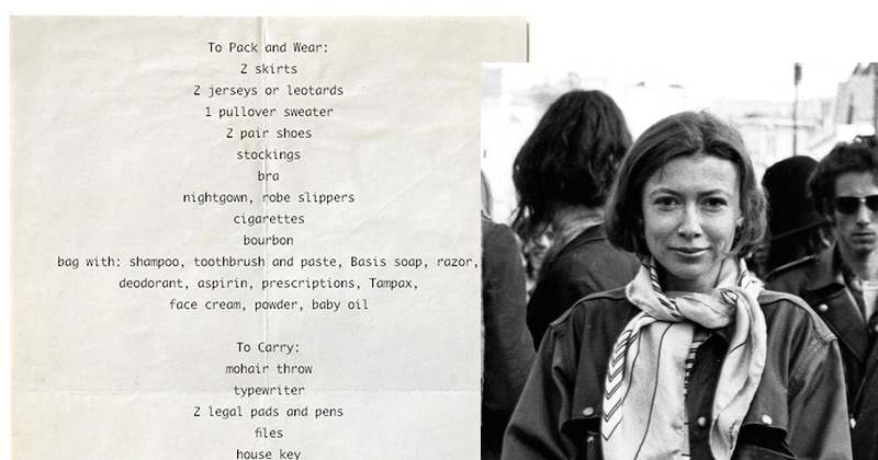 狄迪恩曾描述自己的穿衣风格,“我喜欢宽大的毛衣、长裤、宽松随意的长裙,舒适的鞋。”一套非常符合记者与作家的穿衣风格,“遇见即工作”。 她发表过一份著名的Packing List(装箱清单),文章标题就是《白色专辑》,篇幅不长——两条裙子、两件运动衫或紧身衣、一件套头毛衣、长袜、马海毛毯、打字机,以及威士忌。1979年,狄迪恩出版了同名书籍。