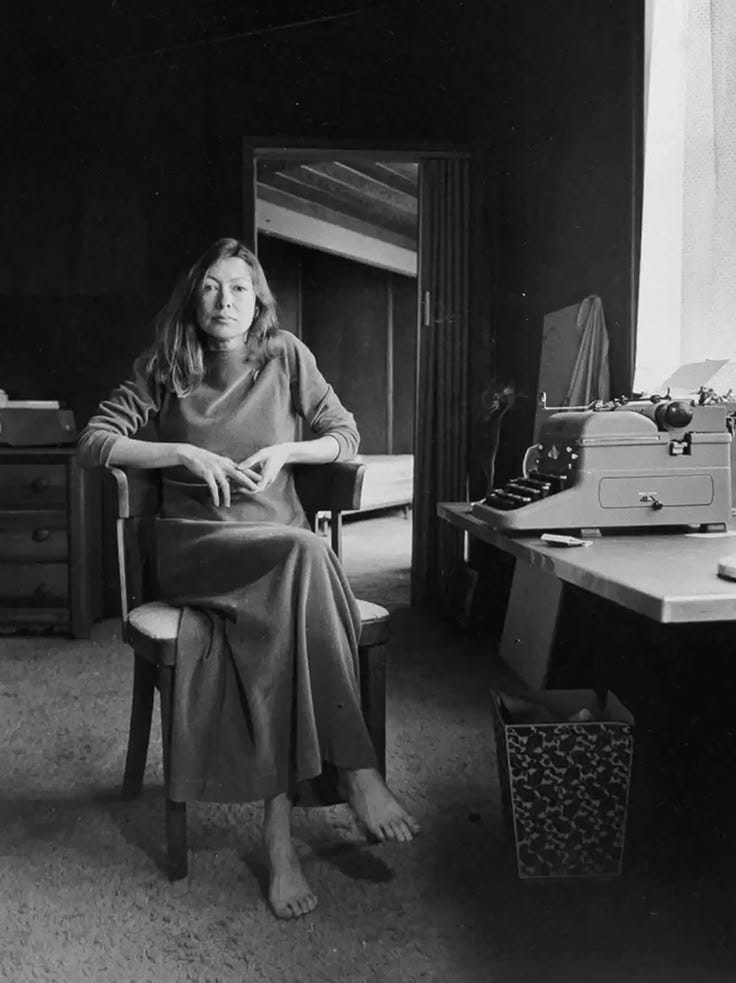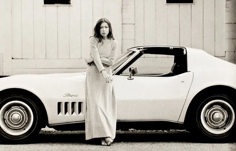 在读狄迪恩的作品之前,我印象最深是她的一张照片,她踩着人字拖,宽松的长裙垂在脚踝,指尖夹着烟,靠在一辆1969年款黄色跑车Chev Corvette上,她有一双冷峻,但带着好奇、思索和直击心灵的眼睛。