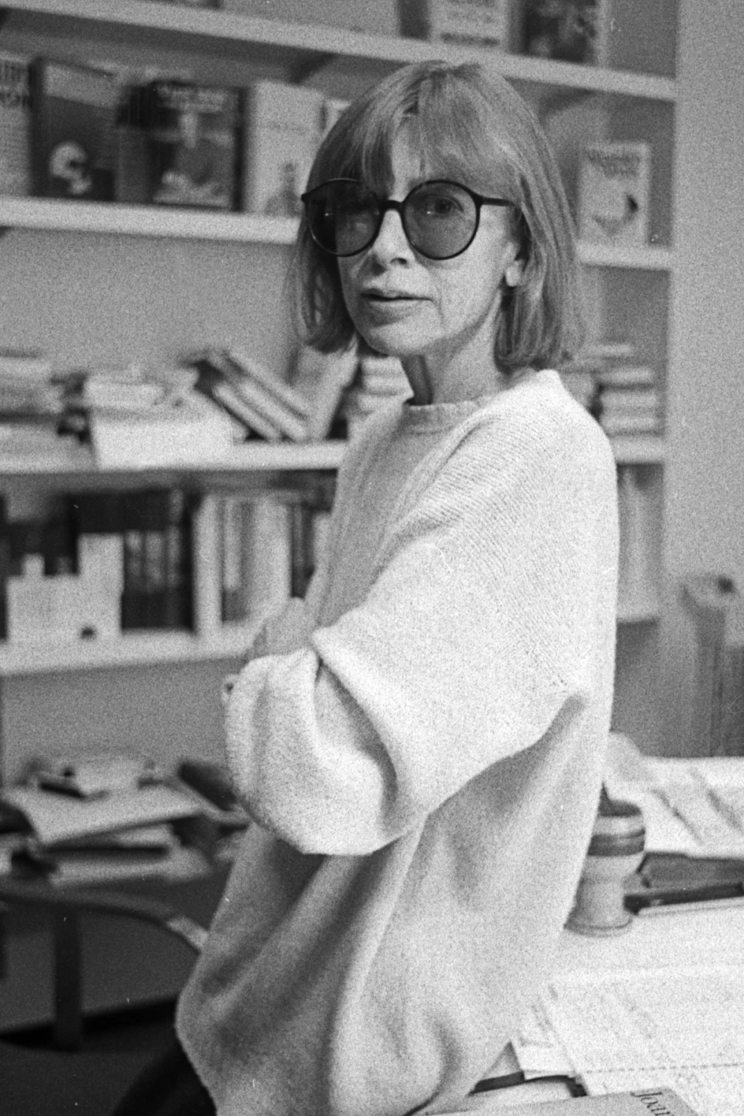 狄迪恩常常戴一副oversize的墨镜。在纪录片《中心难再维系》里,友人与她一起翻看她这一生的照片,“墨镜是她的标志”。2015年,狄迪恩80岁时登上CELINE的春季广告大片,她戴了一副黑色墨镜,利落的白色短发。
