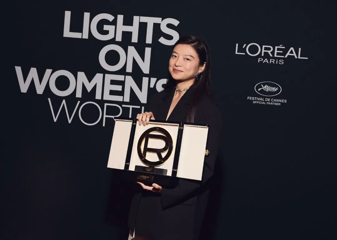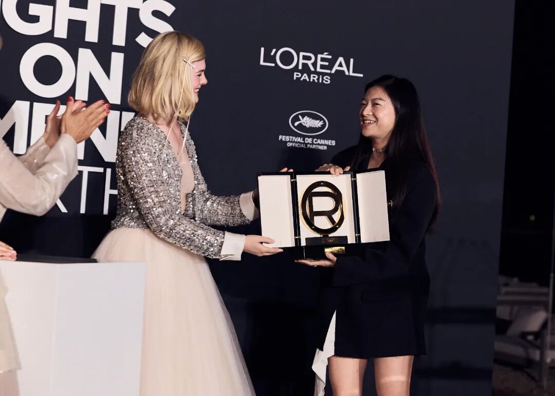 李蔚然在戛纳从Elle Fanning手中接过第四届“Lights on Women’s Worth”的奖杯