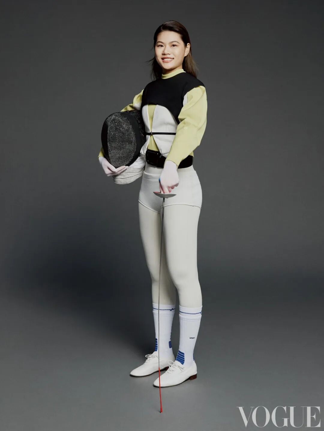 拼色运动上衣、裸色健身裤 均为Lululemon 白色无袖短款上衣 Damowang 黑色无袖搭扣短款上衣 Maison Sans Titre 黑色漆皮宽腰带 Roger Vivier 白色三角短裤 Sean Suen 白色运动袜 Lifebeat 白色系带皮质芭蕾鞋 Repetto 白色手套 Yirantian