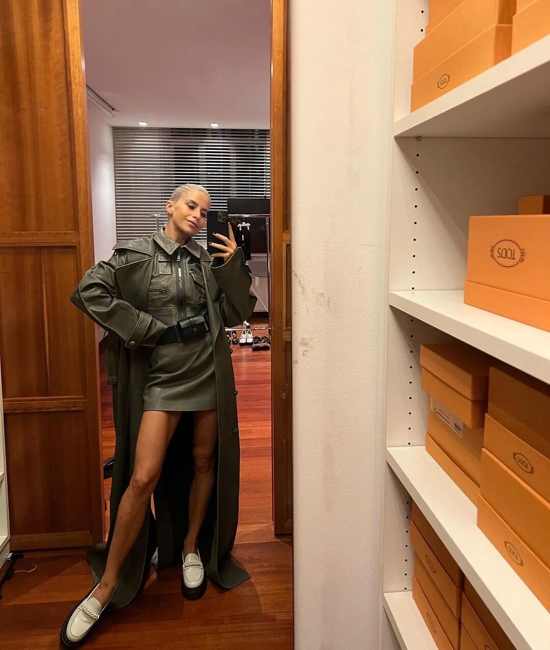Hailey Bieber在最近的街拍中同样多次用到了短裙单品,但她似乎更加热衷于皮裙。选择的外套通常色调也都与半裙一致,强调造型的整体性。