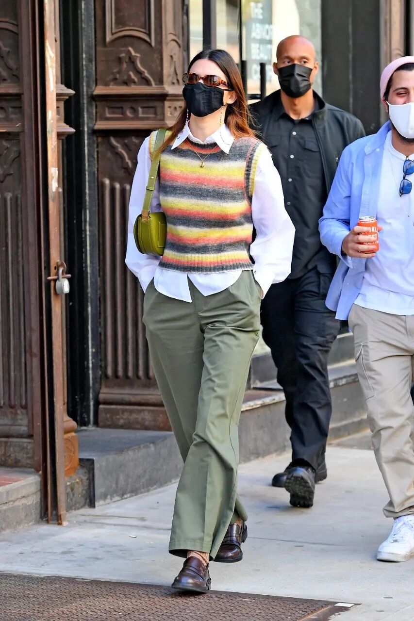 Kendall Jenner此前的街拍造型中也有两件棕色系毛衣单品,一件条纹撞色针织马甲叠穿衬衫,搭配工装裤造型很有少年感;另一件圆点装饰的毛衣则搭配简单修身牛仔裤,十分chill的一套出街装扮。