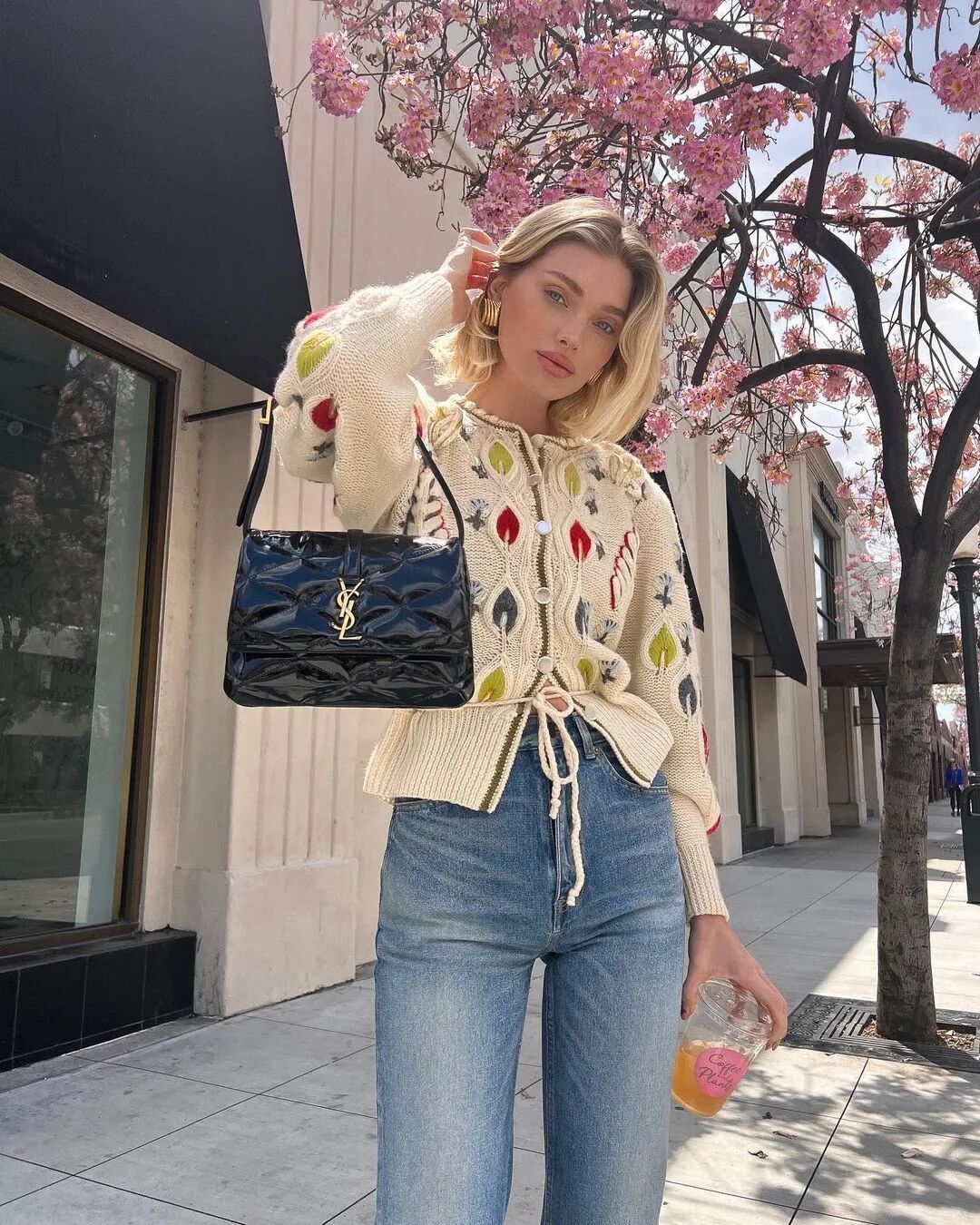 其中印象最深的是她“宅家”期间身穿的一件Miu Miu花朵图案开衫,baby blue配色着实是百看不腻,尤其是肤色白皙的女孩上身效果极佳。