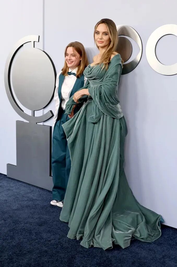在前不久落幕的第77届托尼奖当中,要说现场最受瞩目的嘉宾,无疑是Angelina Jolie和她15岁的女儿Vivienne这对母女,两人都身着蓝绿色造型亮相。今年已经49岁的Jolie依旧美丽,女儿身穿中性风格着装十分率性。
