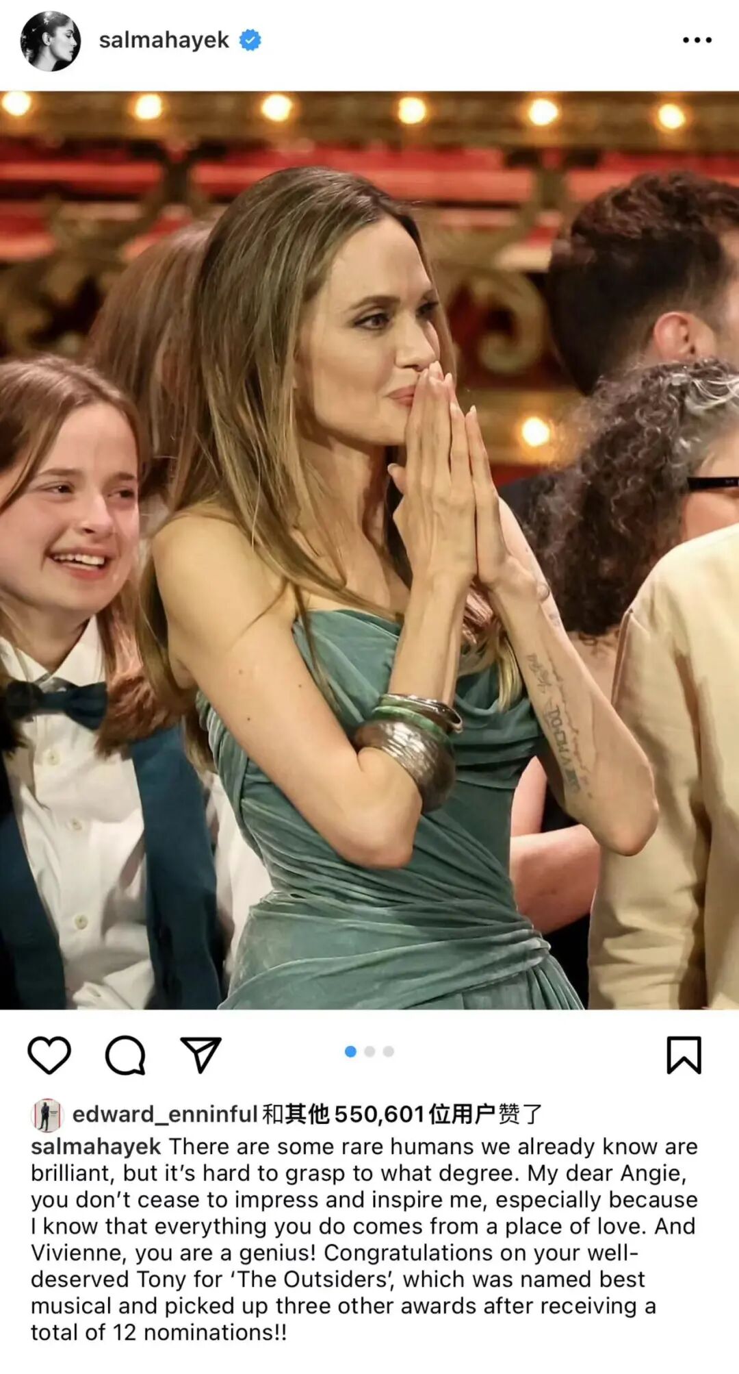 在获奖之后,墨西哥裔女演员Salma Hayek更是特地发了一条ins来祝贺好友Jolie:“亲爱的Angie,你一直给我留下深刻的印象,激励着我,尤其是因为我知道你所做的一切都是出于爱。”