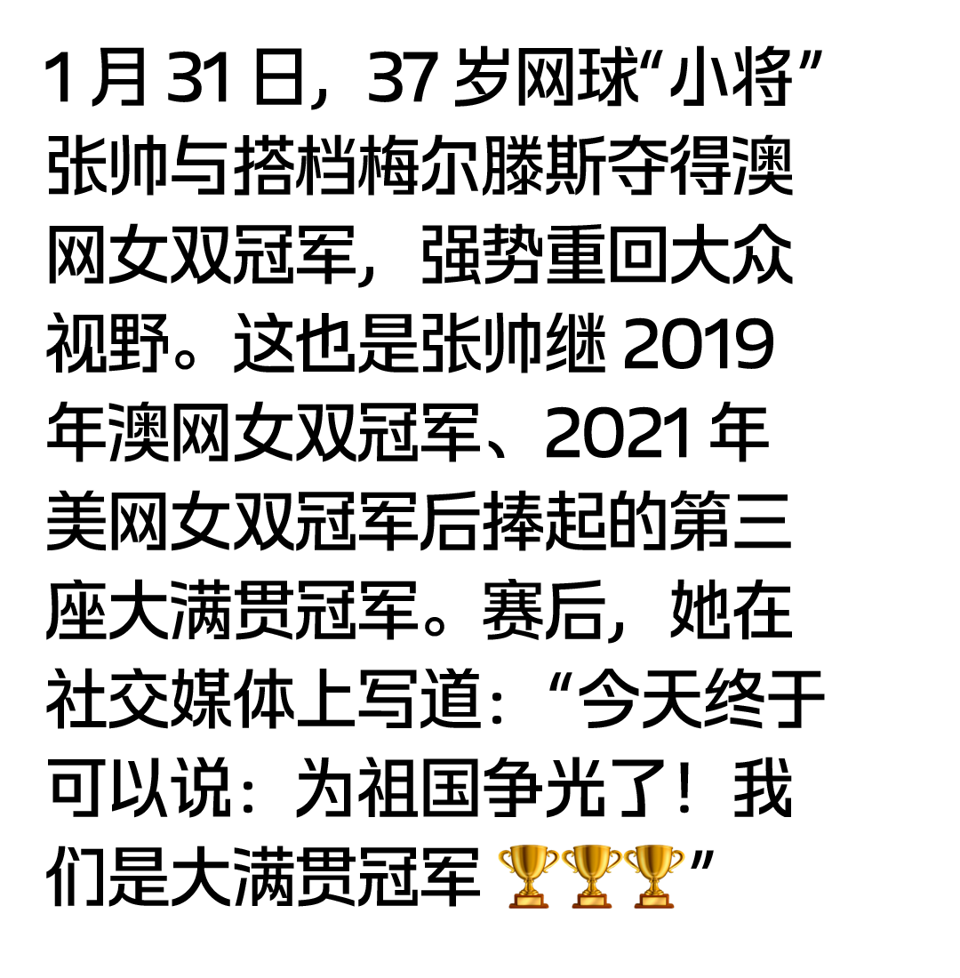 1月31日,从开局1:4打起,张帅和搭档梅尔滕斯在开局不利的情况下逐渐追回比分,最终以7:6、6:4击败对手,强势夺冠。这场球的胜利,让张帅时隔七年再次问鼎澳网。