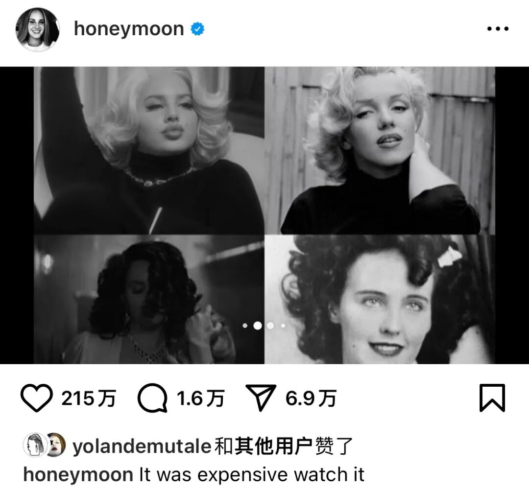 去年,Lana终于舍得“斥巨资”拍摄了一部《Candy Necklace》MV,用四组不同的造型向四位经典女演员致敬,影片长达十分钟,她甚至在Instagram上直接写道:“It was expensive watch it.(姐拍得很贵,给我看它)” 然而没想到她却凭借这首歌一举赢得了2023年MTV音乐录影带大奖(2023 MTV Video Music Awards)“最佳另类奖”,这也是Lana职业生涯中首次获得VMA奖项。