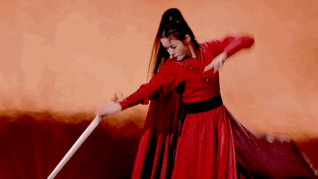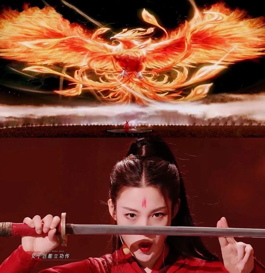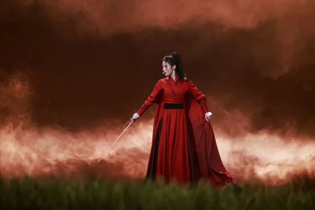 红衣似火,手握长剑,英姿飒爽的她,演绎了一首完美融合戏曲唱腔的《天命》。 瞬间的一抬手,眉心的花钿,则被抹成战斗的锋利。