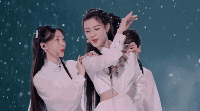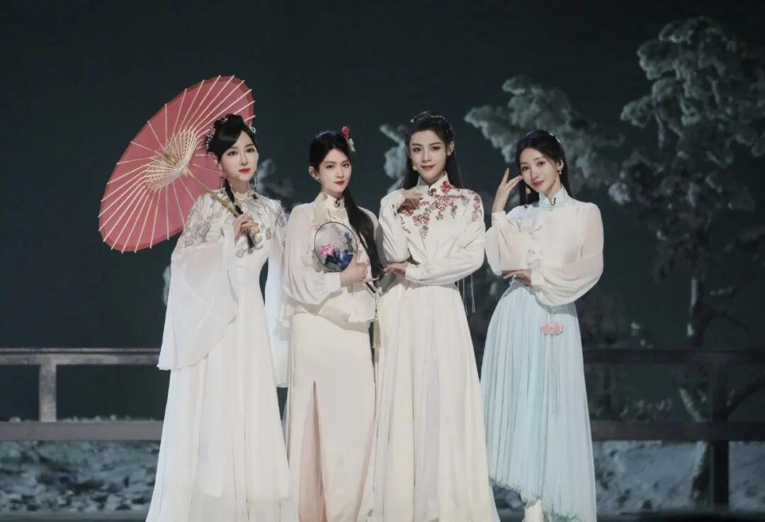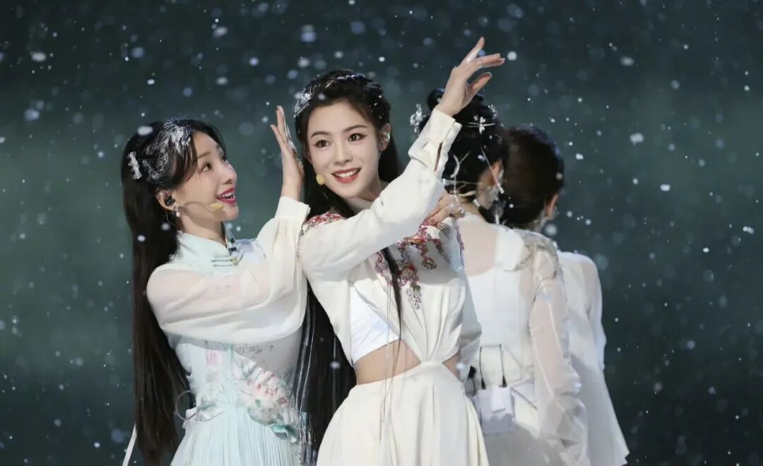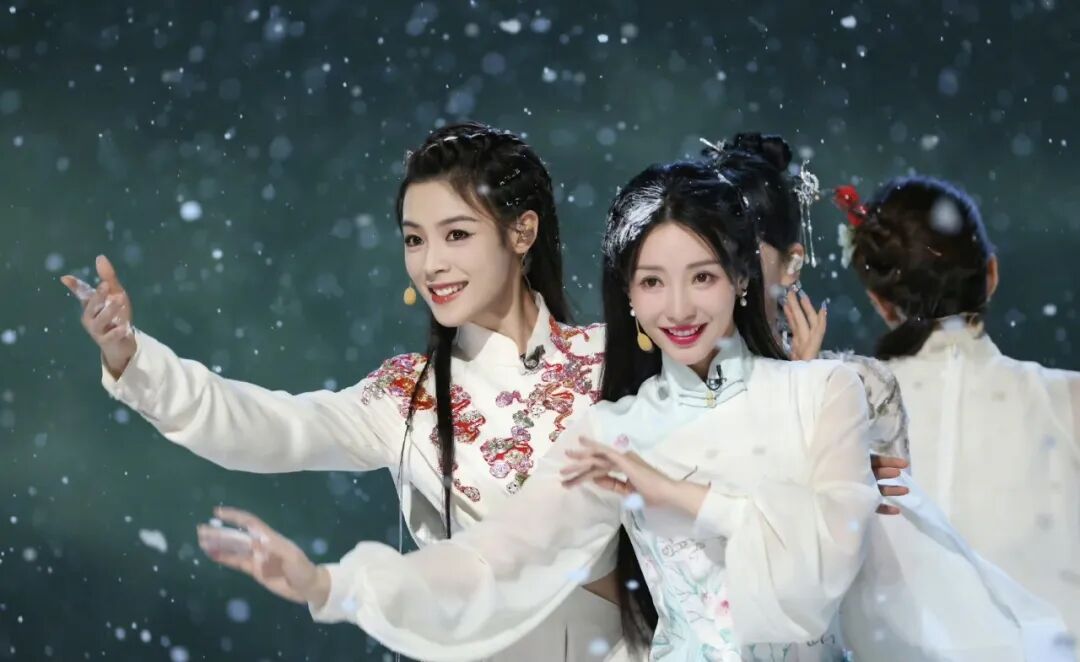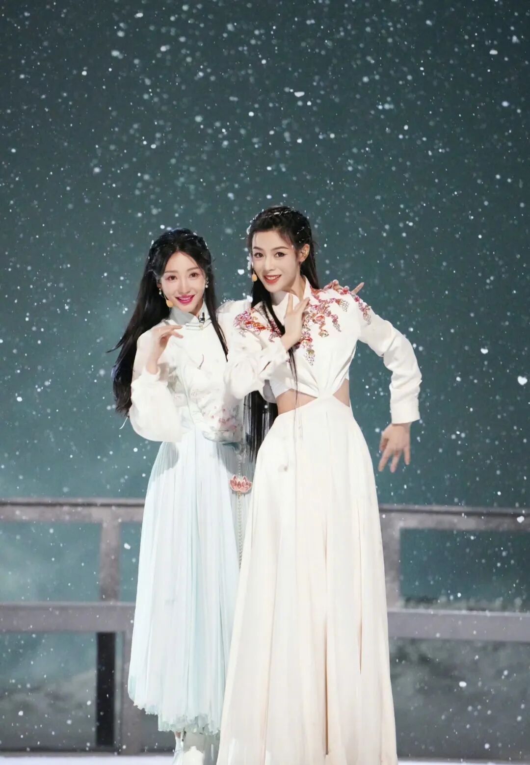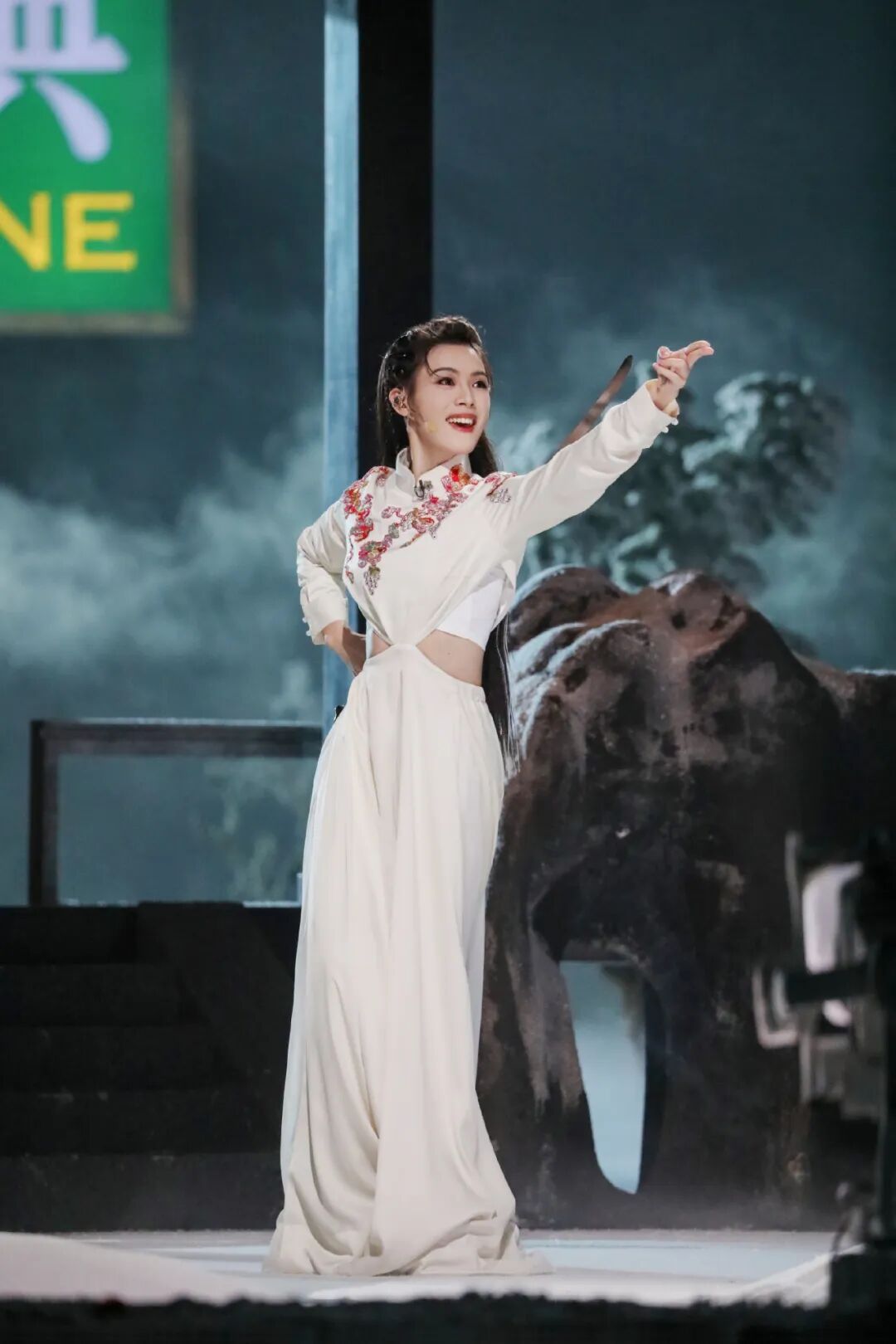漫天大雪落下,美人几袭白衣。她和柳岩、萨顶顶、陈昊宇在皑皑美景中摇曳起舞,余音袅袅,诠释诗情画意的流露。 “朝如青丝暮成雪”,舞台定格的每一帧,美得无比动人心弦。