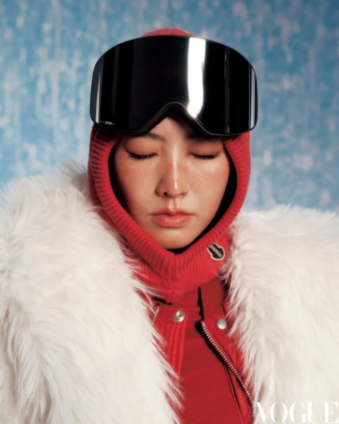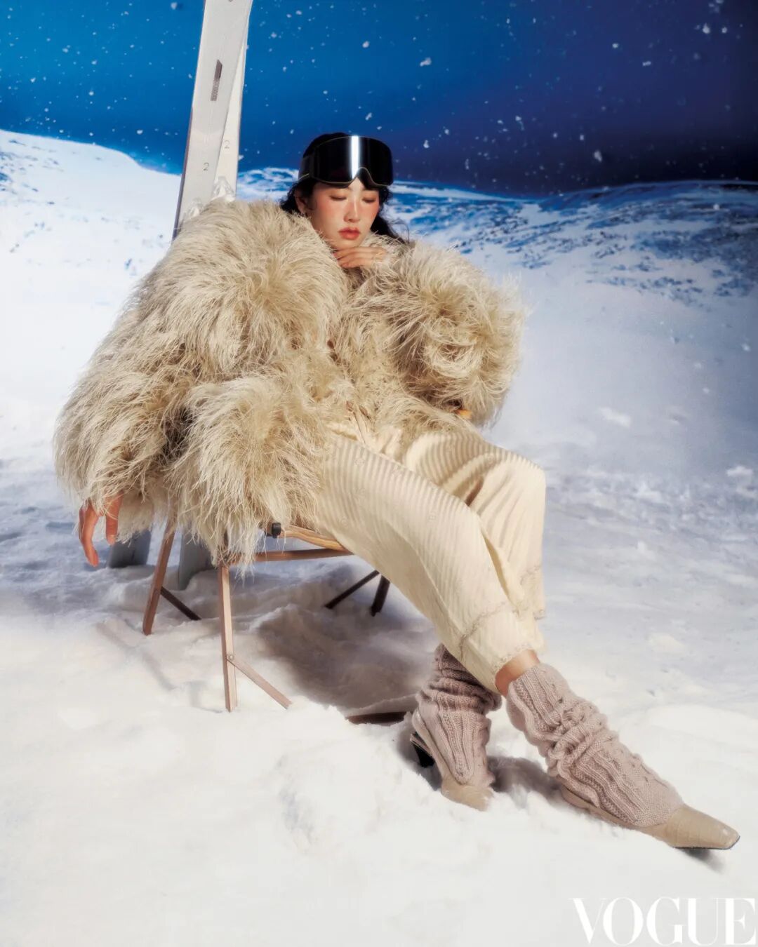粉色内搭、粉色半裙、粉色羽绒服、 粉色头套、黑白雪地靴 均为Moncler 白色长毛外套 Xuzhi;黑色雪镜 Bogner