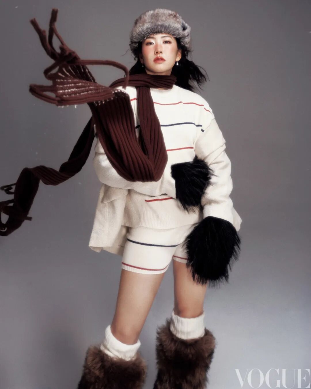 白色西装、条纹针织衫、条纹短裤 均为Brunello Cucinelli 黑色手套 Yirantian;棕色围巾 N. More 灰黑色帽子 New Era;棕色毛绒长靴 UGG