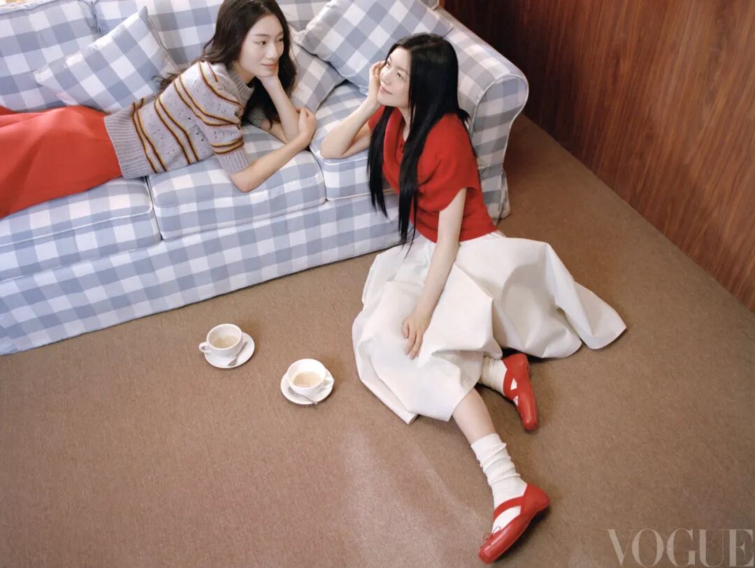 陈妍希: 红色针织衫上衣 Edition 白色半裙 Tod"s 芭蕾鞋 Christian Louboutin 模特: 条纹针织上衣 Marni 红色半裙 Zhuu Da