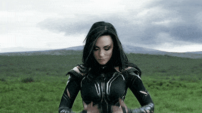 没人会质疑Blanchett的实力,即使是最荒谬、最狠厉的反派角色,她也总能挖到人物隐秘之处的智慧和深度,用让人信服的表演传递出来: 《雷神3:诸神黄昏》中,她是穿着黑色紧身衣,画着浓厚的哥特式烟熏妆的死亡女神Hela,是致命危险与绝对力量的拥有者,分分钟捏碎雷神之锤不是事儿。她也是漫威电影宇宙中的第一位女性反派,而在此之前的漫威“大反派”历史中,全部都是由男性出演;