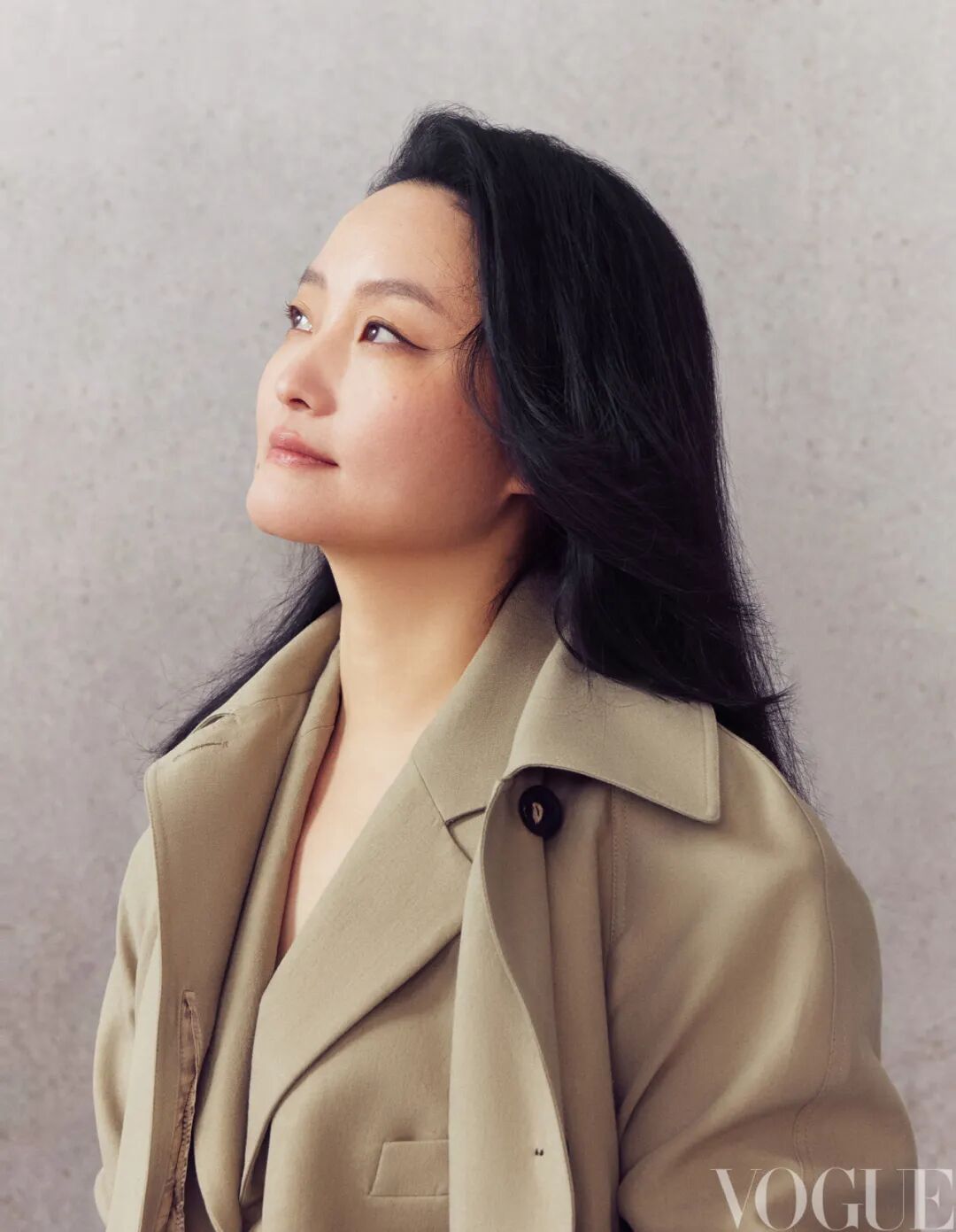 卡其色西装外套、卡其色风衣、卡其色长裤 均为Ferragamo 黑色高跟鞋 Tory Burch