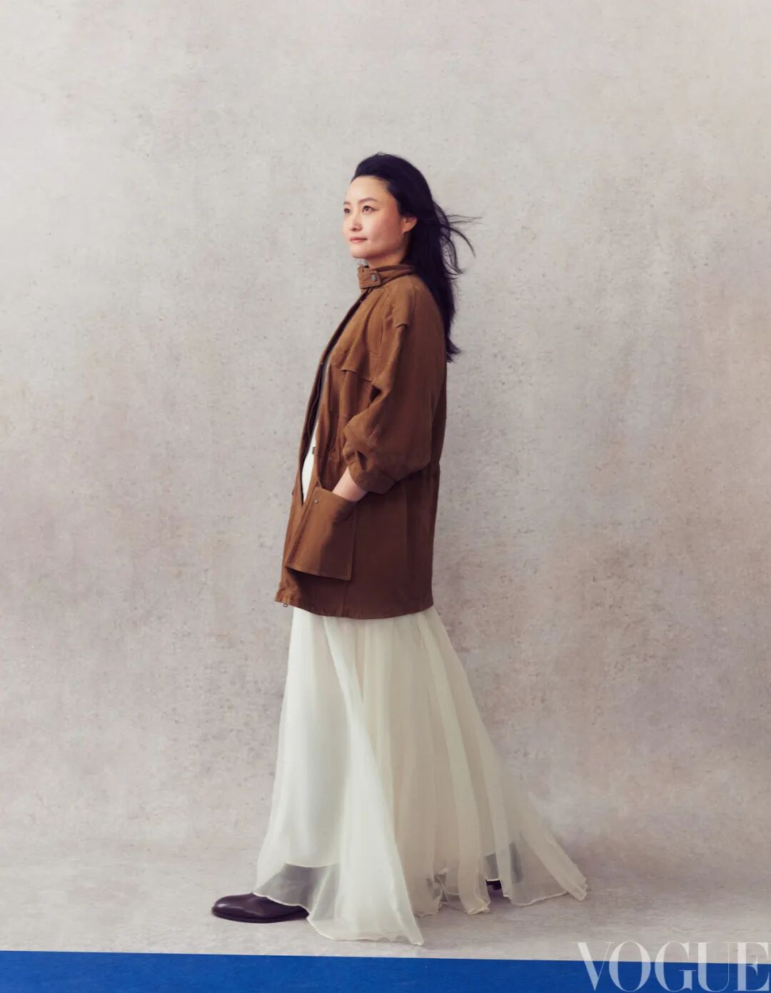 白色长裙、棕色外套 均为Brunello Cucinelli 棕色长靴 Hermès