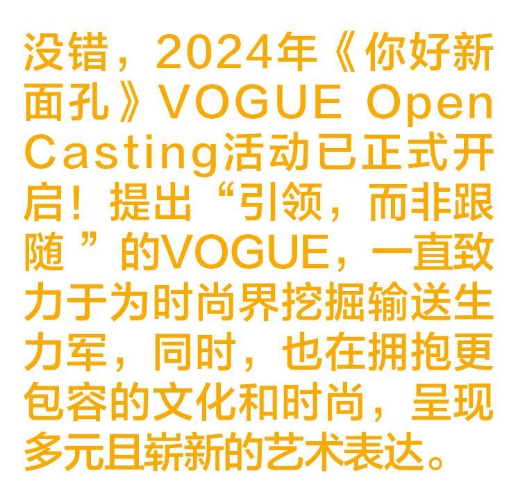 VOGUE致力于为每一位热爱时尚的新人提供圆梦舞台,而今年,她们的多元与传奇将继续交由你们续写。 2024年《你好新面孔》VOGUE Open Casting线上招募已经再次开启,我们见证新面孔的诞生,也见证彼此将更多可能性带向更广阔的舞台。