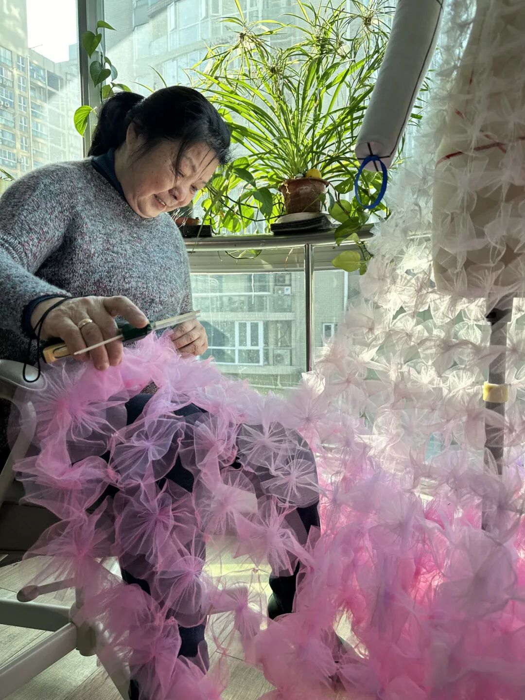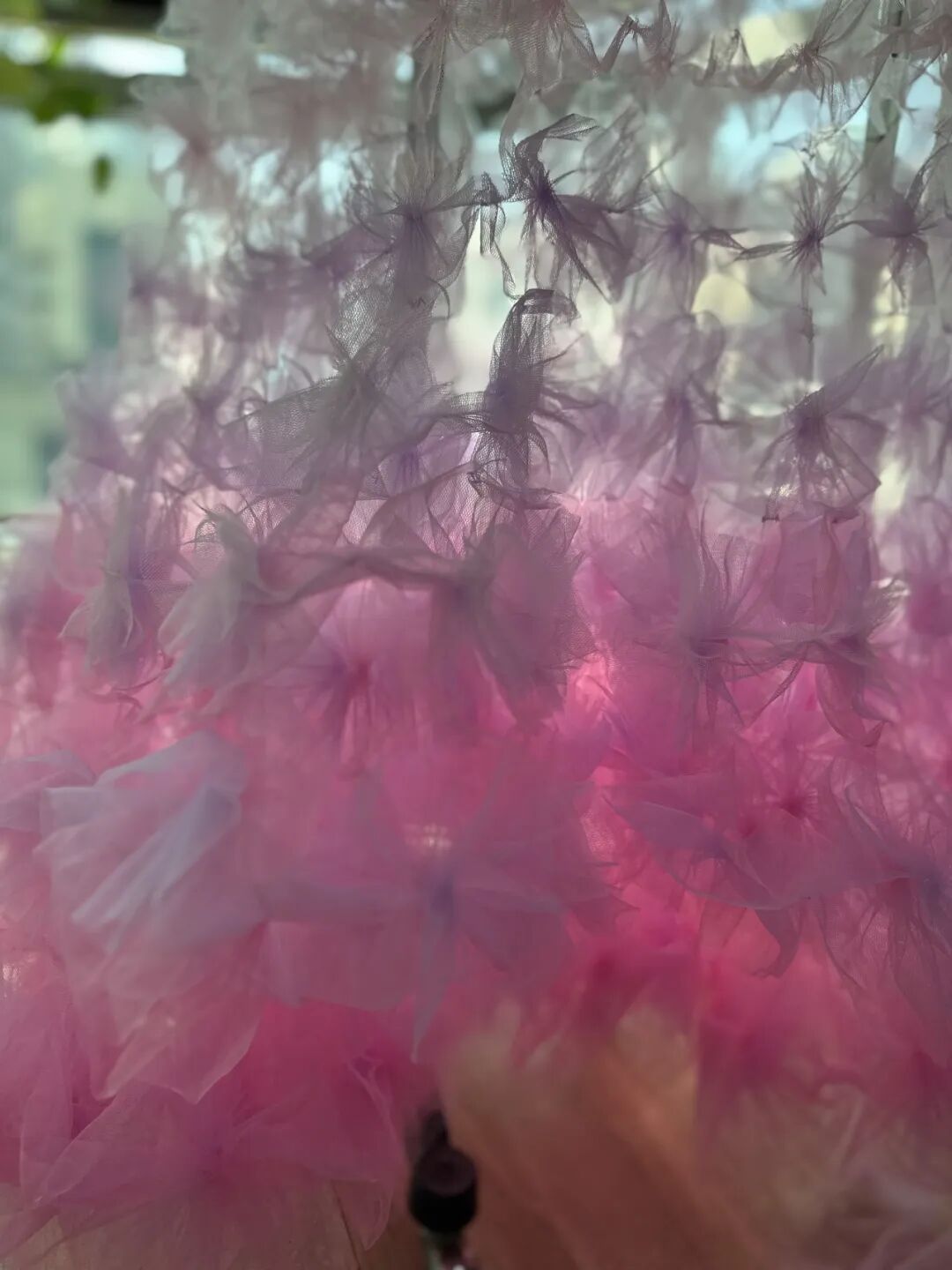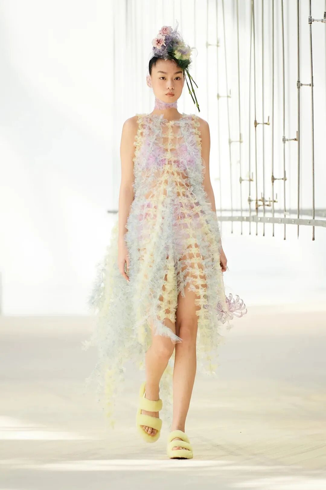 作为服装设计师,Susan用自己的方式诠释对自爱的理解:她用被折断的花和被撕碎的蔬菜绘制成抽象的图章印染纱布,然后在印染好的纱布上裁出一条条宽度不一的面料,再把裁好的面料折叠成一朵朵立体花——迷茫破碎的自己重生为绽放的花朵,这是Susan眼中自爱的过程,也是Susan对自己爱情的祝福。 Susan为这份工艺起名为“空气烟花(AIR·FLOWER)”,SUSAN FANG 2022春夏系列也在此基础上诞生。颜色各异的一朵朵“空气烟花”以横向、纵向或漩涡向在模特身上绽放。很多秀款长裙被客人一眼看中,当作了自己的婚纱。