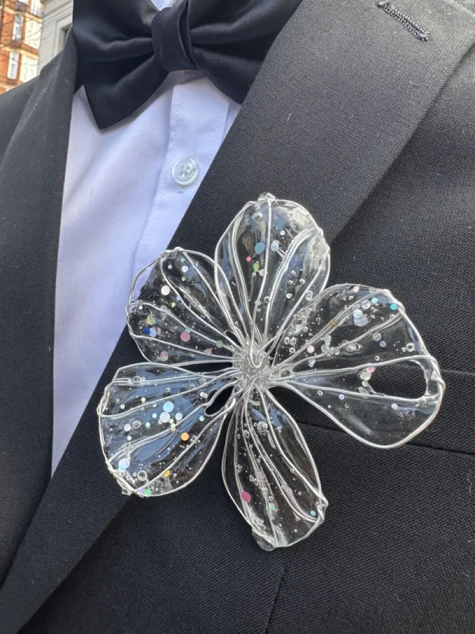 为了这次的登记仪式,Susan和妈妈也赶在仪式前共同手工完成3款配饰:给自己的一对透明耳环和一条泡泡闪花项链,以及给Orelio的一朵反光透明胸花:泡泡闪花项链轻盈梦幻,是SUSAN FANG最具代表性的空灵的水晶珠风格;耳环和胸花的设计灵感来源于会发光的微生物:虽然微小,但仍然能散发星星点点的光晕,像爱情里无数动人的、令人惊喜的细微瞬间。