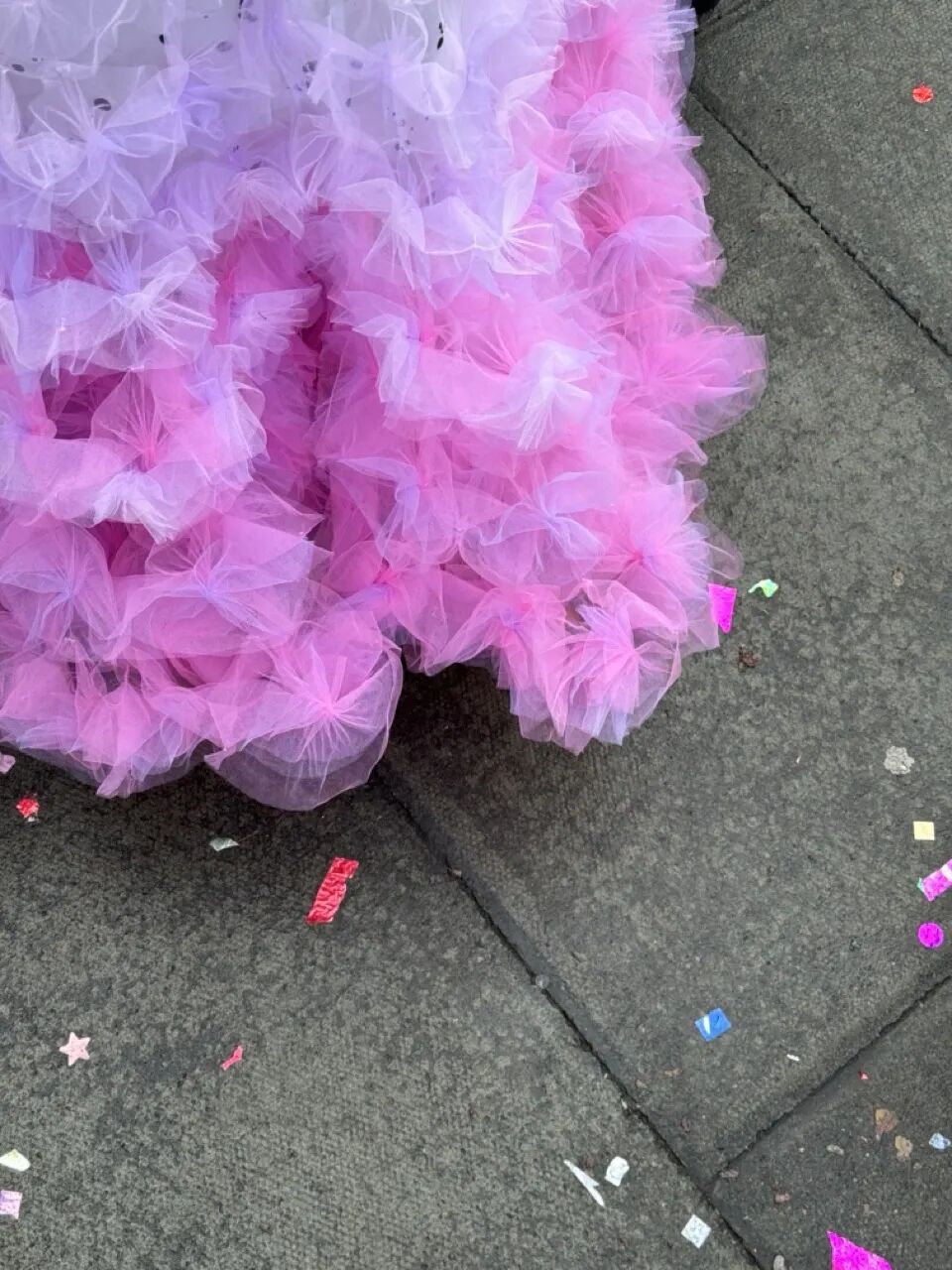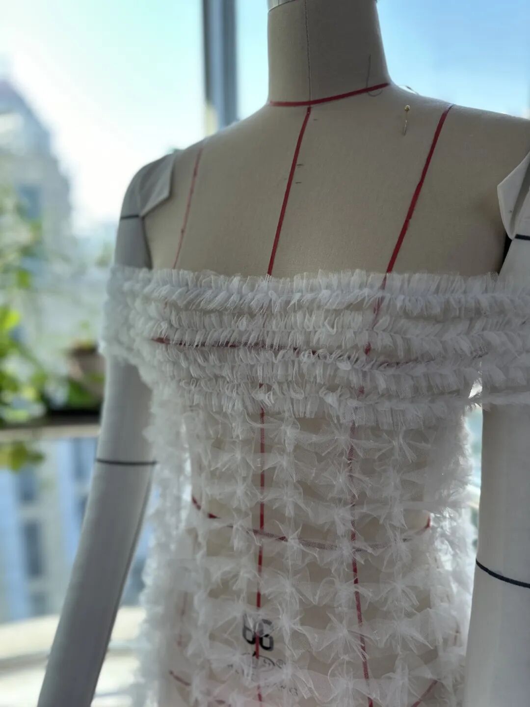 Susan的婚纱完美延续了SUSAN FANG一贯的可持续理念。因为采用了“空气烟花(AIR· FLOWER)”的工艺,所有剪裁后又重新折叠成花朵的面料都会被百分百利用,不会像传统制衣剪裁方式那样产生面料浪费。此外,裙子的每一层都是用一条条面料手工连接而成,所以在制作过程中,任何调试都可以直接拆掉再做新的折叠,不需要去做配样而造成额外浪费。得益于工艺本身的灵活,Susan希望这件婚纱是流动的——在登记仪式结束后,裙子也许会被轻松地拆解成一件上衣、抹胸或一条短裙,在往后的日常里用另一种形式见证更细碎的幸福。