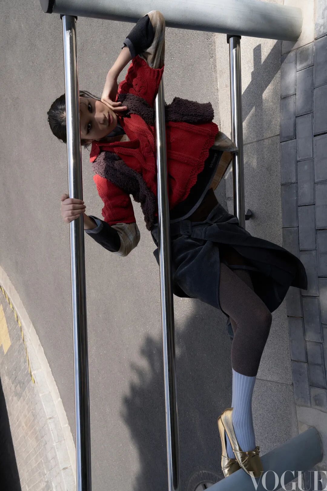 蓝色衬衣、针织上衣、红色短袖针织上衣、格纹衬衣、咖色针织马夹、灰色开衩半身裙、拼接长袜均为WMWM
