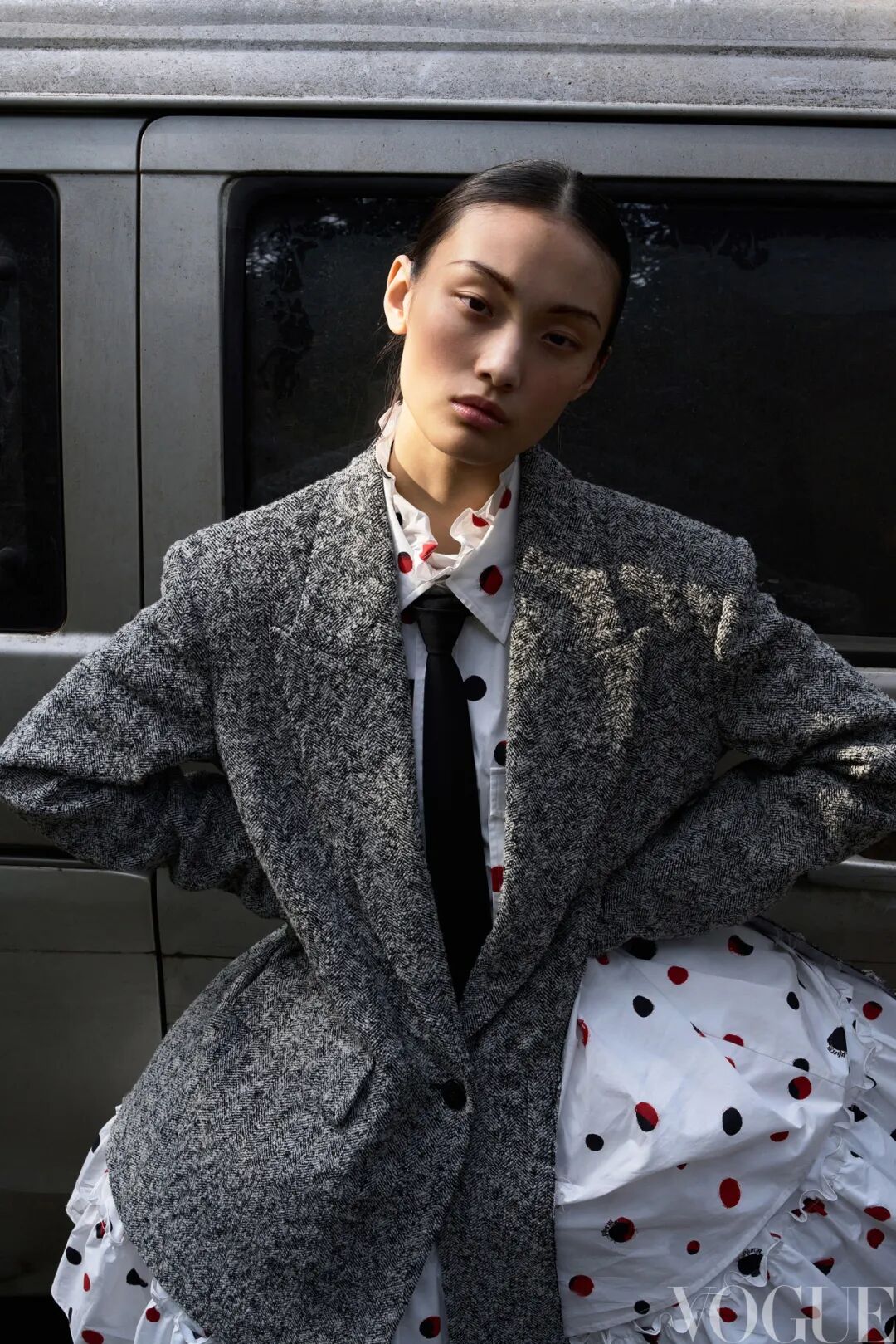 波点衬衣裙,波点衬衣,灰色西装外套和领带均为PHÓRM