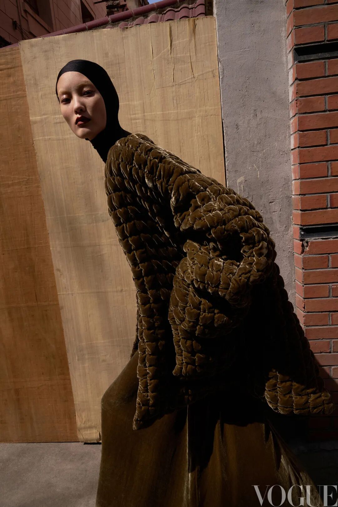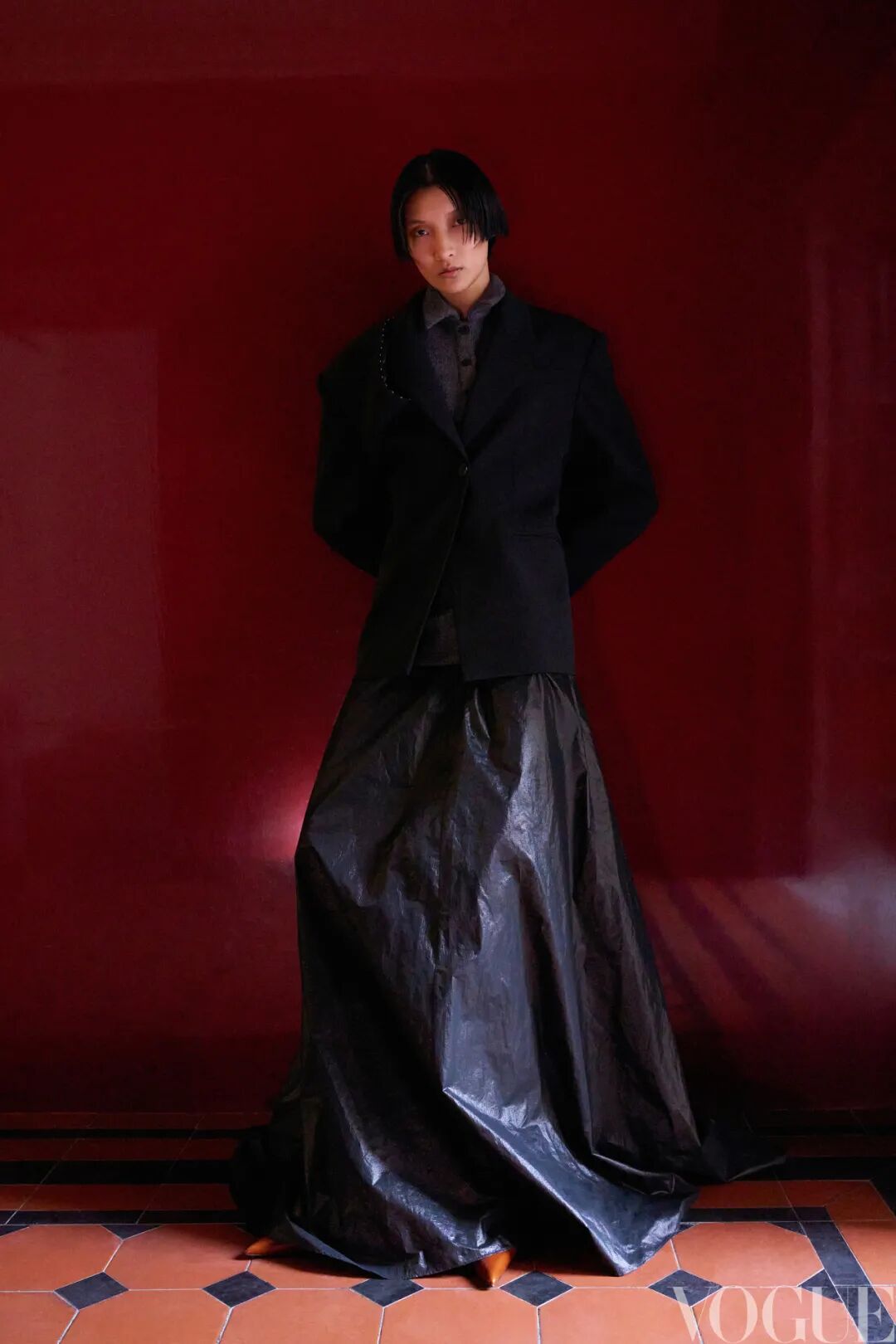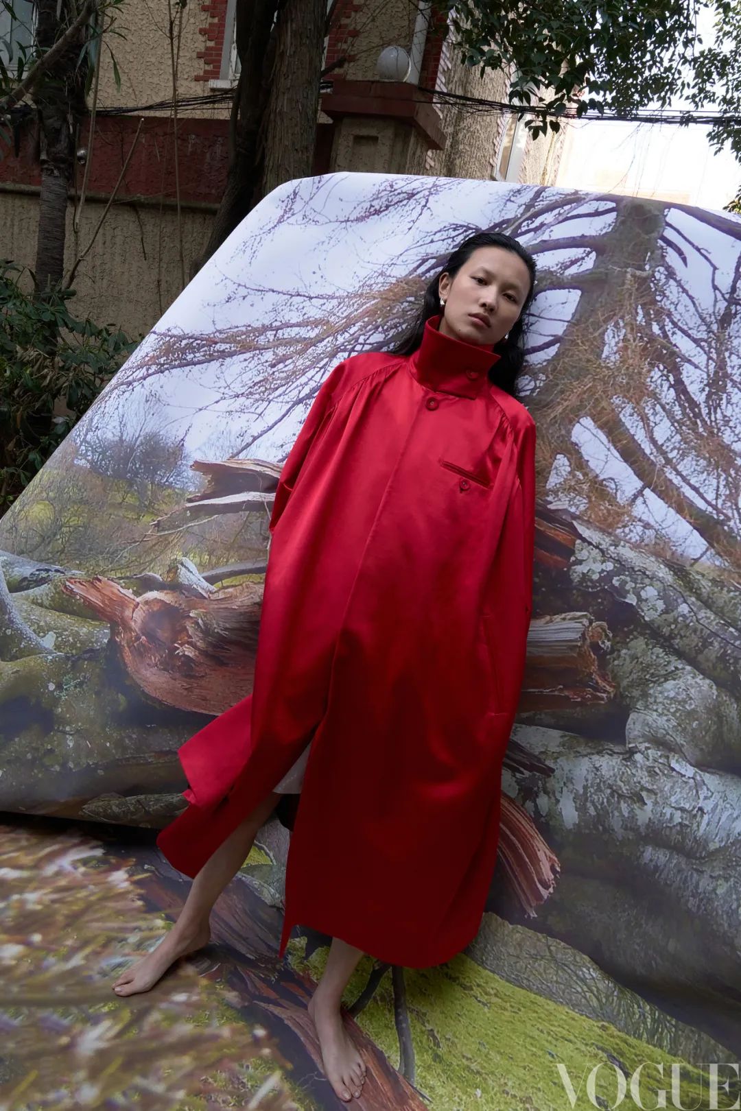 红色的雕塑感棉袄,材料轻盈又有力量,极大的体量感包容力十足,通过这套衣服,得以探讨身体与衣服,身体与空间的关系,并且突破传统审美对女性曼妙身材的定义。真正的“美”不拘一格,可以自成一派。