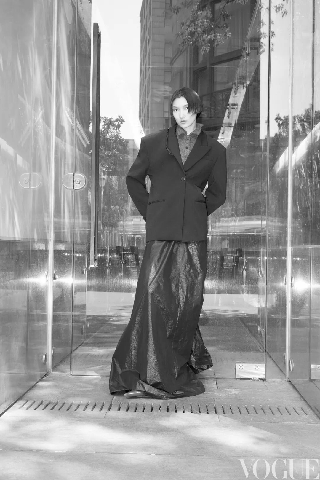 黑色鱼骨背心、廓形半身短裙均为SHUSHU/TONG