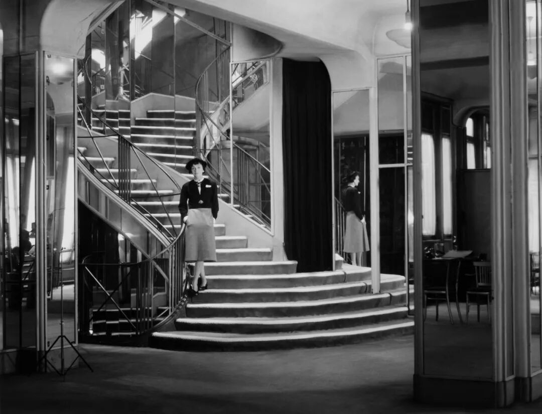 嘉柏丽尔·香奈儿于巴黎康朋街31号精品店内的镜梯上,1953年。照片由Robert Doisneau掌镜。