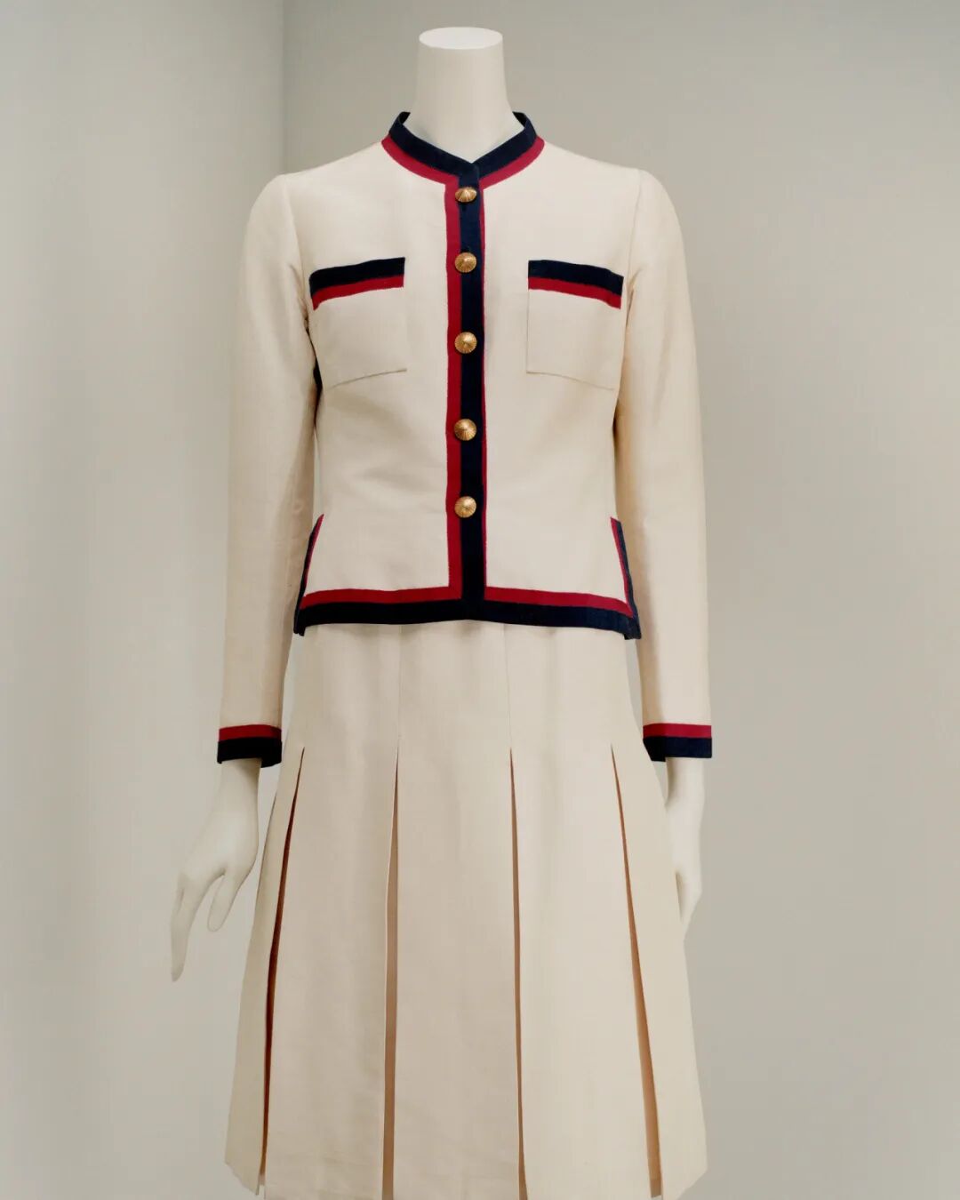 套装:外套、衬衫、领带和半身裙,1964年,斜纹软呢,马塞尔·吉列曼山东绸,镀金金属