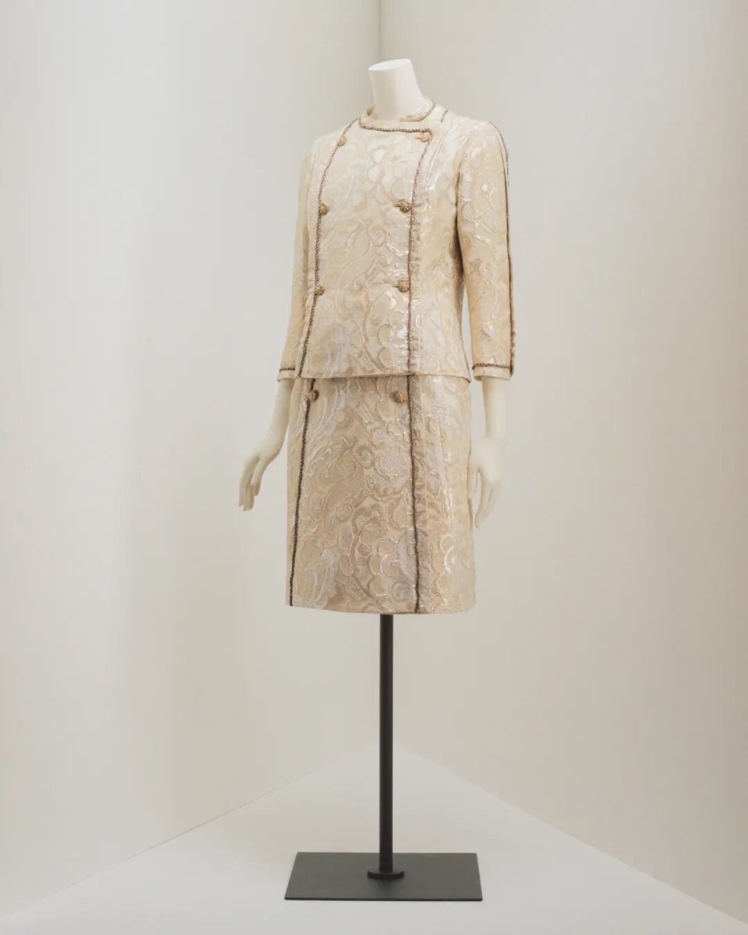 嘉柏丽尔·香奈儿穿过的套装,1958-59年秋冬系列,米色与棕色云纹Lesur斜纹软呢,镀金金属。巴黎,香奈儿品牌传承部。Julien T. Hamon