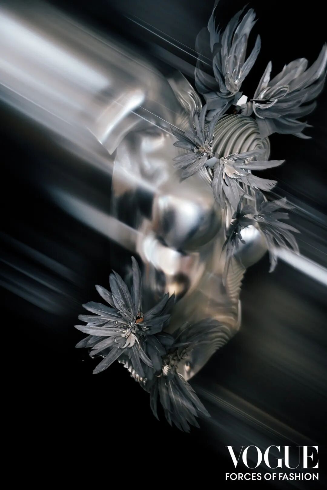 从你自己的角度出发,你最希望大家关注到你的是什么? 希望大家了解我对于数字时尚艺术的深耕,以及我作品的多元性和跨领域属性。这次作品的创作既有数字影像也有实体交互装置,充分结合了人工智能、数字设计、智能制造技术来探索数字时尚的可能性,是对VOGUE命题的回应也是对自己多年研究的总结,未来希望能够有更多有趣的跨领域合作和艺术创作中的自我突破。 在数字领域,你觉得最有趣和最具挑战的部分分别是什么? 我在数字领域最感兴趣的方向是混合现实穿戴,也就是实体与虚拟融合的数字服装。空间计算的时代即将到来,当虚拟信息能够被叠加到真实世界之中被人们的双眼直接观看时,这才是数字服装的更大市场和应用场景。我目前面临的挑战同时我也认为是机遇,就是把虚拟场域的设计转化到现实生活中,也就是将数字模型进行实体化制作后能够被目标人群舒适的、高频次的穿戴,目前我已经对配饰的实体化转换有了大量的尝试,也完成过全3D打印的服装,未来想更多的研究基于3D打印技术的柔性织物,制作可以实穿的、个性化定制、精准对位生产的3D打印服装。 你怎么看待数字时尚的未来,它如何与大众产生联系? 首先是虚拟时装秀、混合现实时装秀将大规模出现,虚拟手段能够为实体服装提供营销传播和创意展示的附加值;其次消费者也可以进行虚拟试衣,甚至沉浸式全息影像购物,能够提前看到虚拟产品的穿戴效果再决定是否购买,品牌方可以以需定产,极大的减少库存压力并减少退货率;再者,依托于数字技术的时尚产品,例如3D打印配饰和服装将会更加普及,精准对位的数字化设计和快速响应的智能制造也能够满足消费者三维定制和参与设计的需求;同时人工智能技术推动下的服装大模型也将越来越成熟,能够预测时尚趋势、提供个性化建议,同时AI驱动的设计工具将使得设计师能够更高效的创作,消费者也可以享受更加定制化的产品。