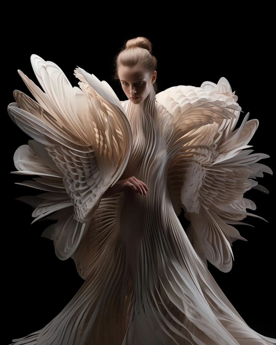 你的创作实践包含时装设计和数字艺术两部分,你是如何将两者结合在一起的? 我的设计精专集中在数字时尚中的服装领域,也就是对于数字服装本身结构、形态、材料、动效和穿戴方式的研究,能够将以制版缝纫为基础、以面料为主体的布料解算类型的数字服装,和三维成型、硬表面建模的数字服装相结合,创造新的服装形式和语言,并且我也可以将这些虚拟的产物转化为实体的数字产品,在这个核心之外我的设计实践也拓展到了数字人、数字置景、三维动画和VFX特效领域。 你会如何向大众介绍你的创作领域和风格? 我专注于数智语境下未来时尚(时装、配饰及材料)的跨学科研究,研究领域包括数字化设计、人工智能时尚、智能穿戴及可持续时尚设计模式。“参数自然”是我美学与设计研究的核心——用“秩序”创造“无序”,通过算法设计“设计机器”,将自下而上的算法驱动生成与自上而下的人类美学控制相结合,输出不可预测但可控的设计,以人工编辑的方式重塑自然生长的形态。对立事物的有机统一、阴与阳、直与曲、刚与柔、张扬与优雅、有序与无序的平衡是我的主要创作哲学。