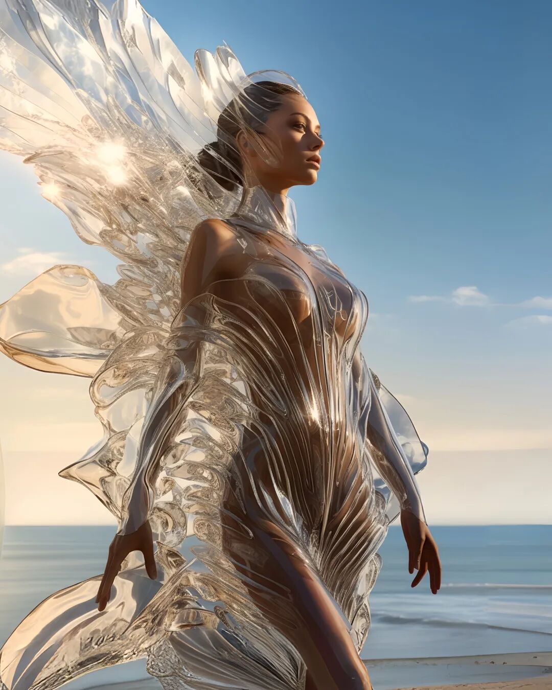 你最欣赏的设计师或者艺术家是谁? 我最喜欢的设计师是扎哈·哈迪德,扎哈·哈迪德以前卫的建筑设计风格而闻名,以参数化设计方法驱动流线型和非线性结构生成复杂几何形态,这种创新的建筑语言激发了我在数字时尚设计中运用算法设计构建身体建筑物的尝试;其实扎哈·哈迪德是一位极具跨领域思维的艺术家,她的作品涵盖了建筑、艺术和工程等多个领域,这种综合性的视角帮助我将不同领域的灵感和新技术融合到数字时尚设计中,创造出突破传统的作品。有幸在去年12月,我的数字时尚作品受邀作为首个时尚展览展出于扎哈·哈迪德建筑事务所推出的元宇宙METROTOPIA。 聊聊这次的参赛经历吧,你的决赛作品创作过程是怎么样的? 我的创作过程深度结合了人工智能技术以及CG建模技术来完成数字时尚影像《一如万物 | One as All》,最后通过3D打印技术和交互技术制作了实体的服装装置。拿到主题首先我开始叙事构思和故事板制作,思考如何通过画面内容、镜头语言和叙事逻辑来展现美美与共这个主题,因此将数字影像作品分为了两个章节:“各美其美”和“美美与共”,希望将不同的空间和人物通过时空隧道串联起来,由各自美丽走向融合之美。有了初步构思之后便开始使用AI技术进行初期的概念美术设定和分镜制作,结合自己的个人风格来确立人物、服装和场景的大方向。确立大方向后,我以设计师主观的审美和思想为核心进入精细化的CG建模,去优化AI辅助设计的初期概念,实现创意的可控化,完成虚拟人、虚拟服装和虚拟场景的设计和建模。最后进入渲染环节,除了正常的CG渲染流程,我再次介入了AI技术来进行辅助性渲染,以达到更加超现实的视觉效果。最后我将数字时尚影像中的一件具有代表性的服装3D打印制作出来了,这个动态交互服装装置是以身体的“第二层皮肤”为基底制作的身体表皮雕塑,可以通过磁吸的方式将不同的装饰性部件组合到表皮上,来表达保留个体独特之美的同时,融合接纳不同的美。以身体为“一”,融合出“万物”,存身体之美,与天下共美。