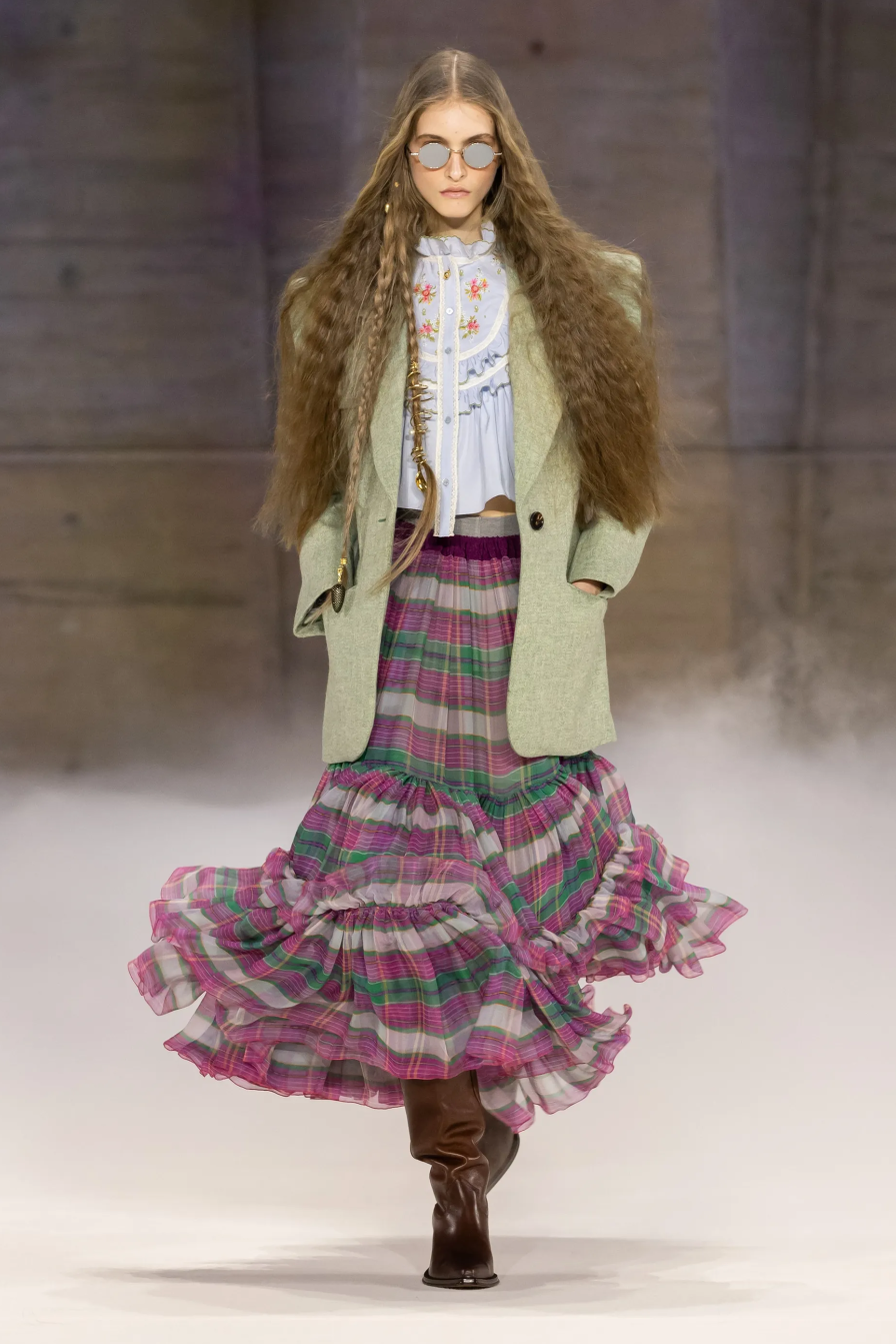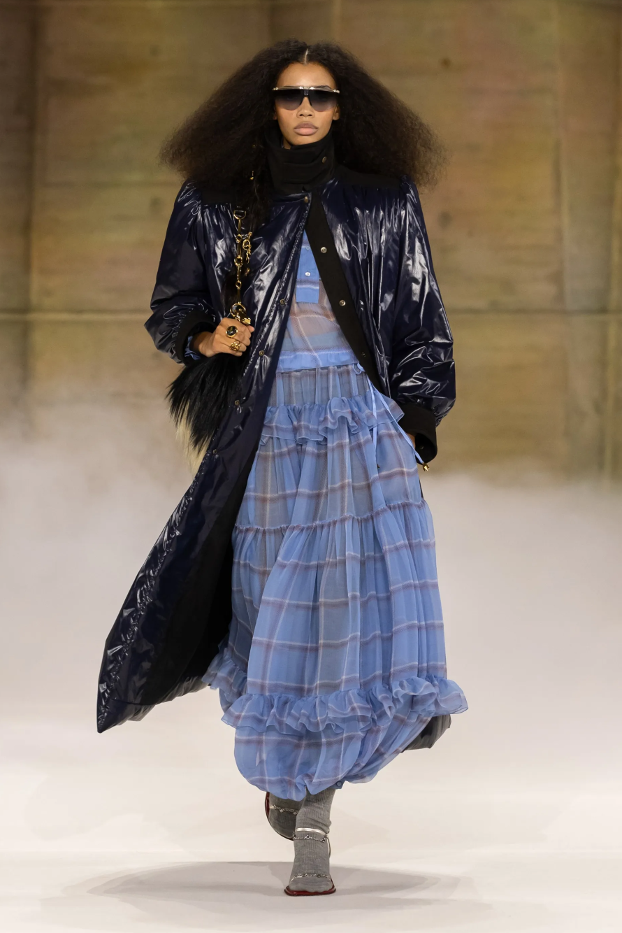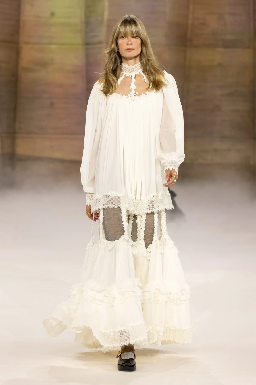 量感,成为最核心的设计语言。层层叠叠的针织、薄纱与模特蓬松的发型,构成一种扑面而来的活力,Kamali并没有局限在当今的主流时装趋势中,而是纵向强化了品牌与历史根基、与文化议题的关联性,这无疑为Chloé赋予了更多有深度的内在精神性。换句话说,Chloé女孩的外在形象已经足够完美,Kamali正在做的,是在不断充实设计的品格特质,让品牌由内而外地打动人心。