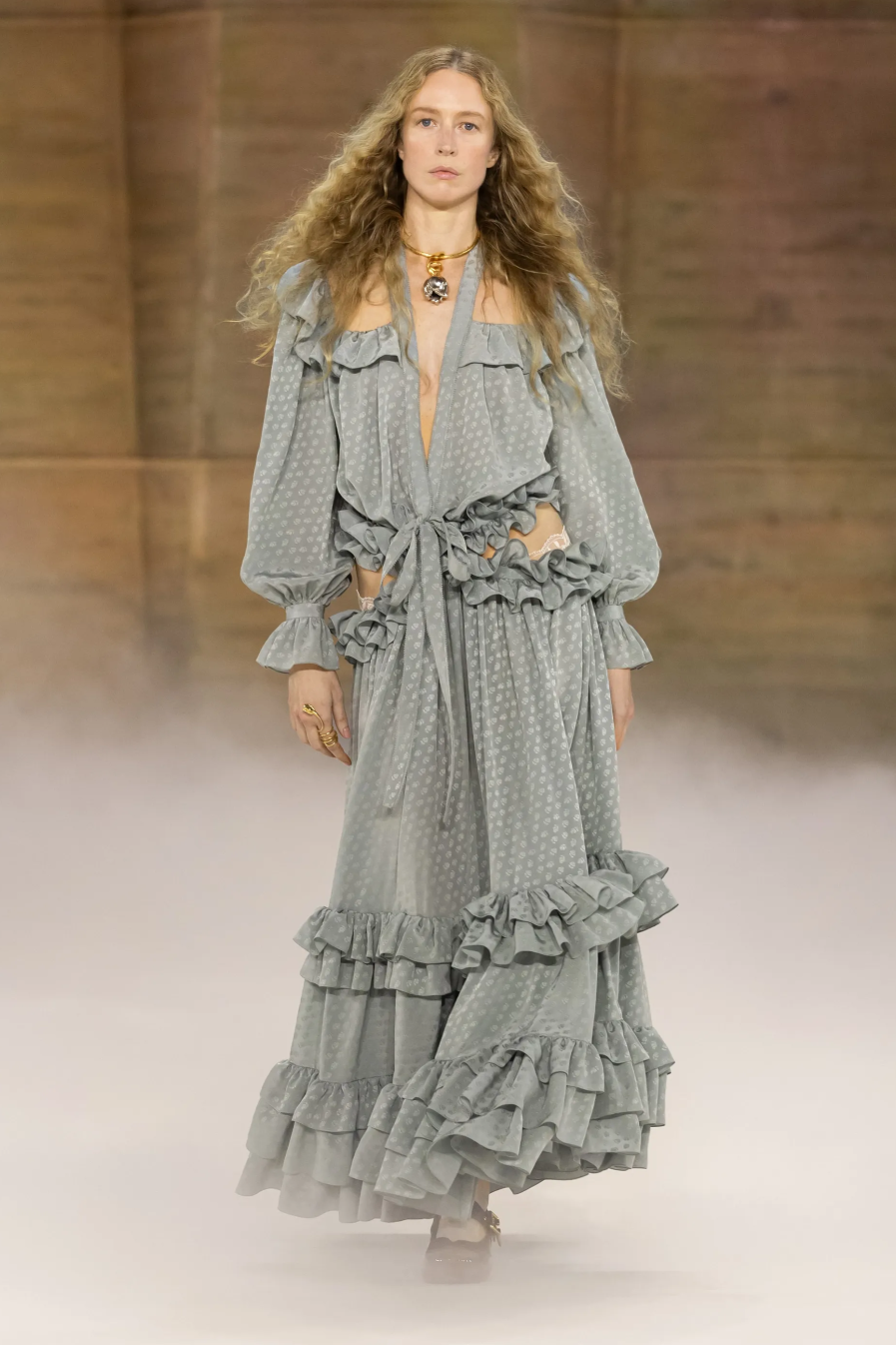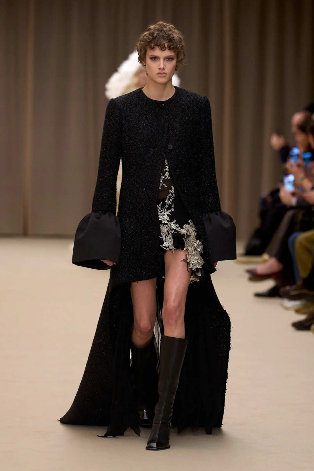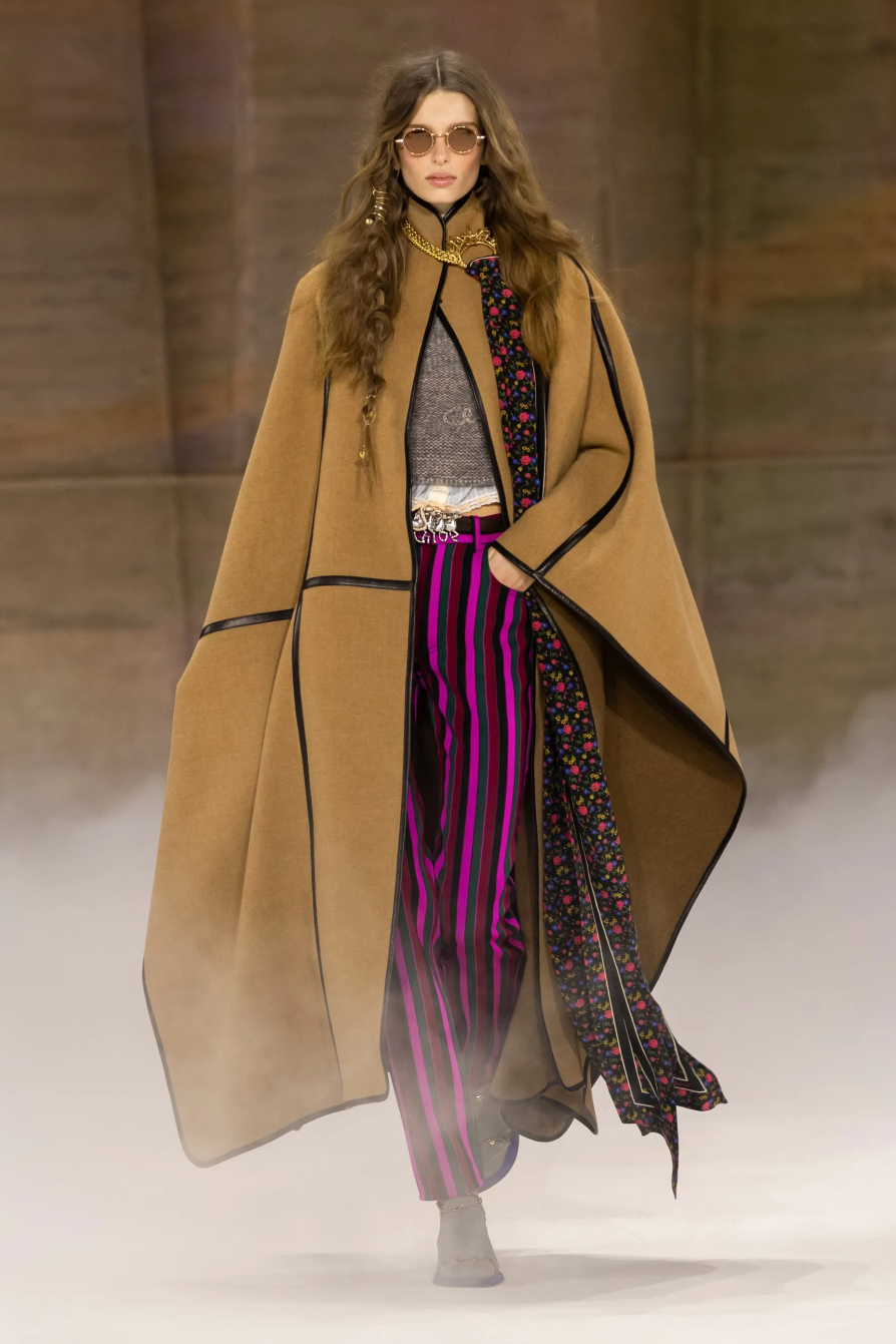 量感,成为最核心的设计语言。层层叠叠的针织、薄纱与模特蓬松的发型,构成一种扑面而来的活力,Kamali并没有局限在当今的主流时装趋势中,而是纵向强化了品牌与历史根基、与文化议题的关联性,这无疑为Chloé赋予了更多有深度的内在精神性。换句话说,Chloé女孩的外在形象已经足够完美,Kamali正在做的,是在不断充实设计的品格特质,让品牌由内而外地打动人心。
