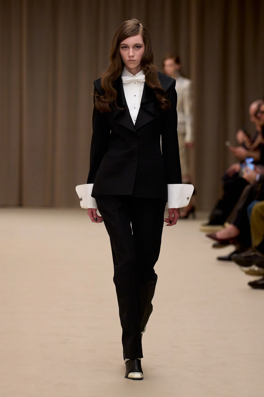 仔细看,秀场上这十四套吸烟装并非简单的换色重复,不能只通过图片做“消消乐”式的理解。这些套装的贴身程度、领口开合的大小、肩头和腰部的放量和收窄、领口的角度比例,单排或双排扣,皆呈现出与人体完美融合的微调,而这也是品牌的“吸烟装”发展到现在,致力于“为女性而创”的最好证明。